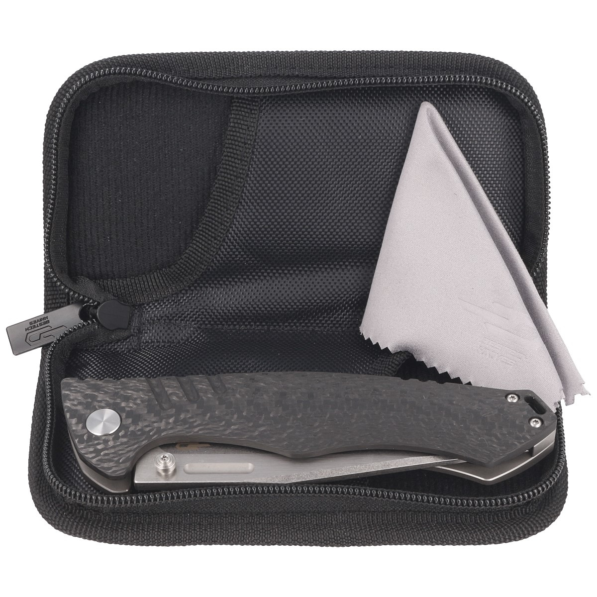 Case - the knife is packaged in a zippered nylon soft pouch with the brand's logo for safe carrying and storage of the folder.