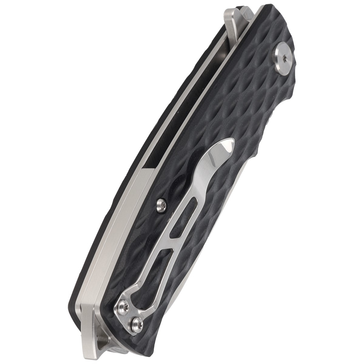 Handle - black G10 composite liners, a practically indestructible plastic insensitive to weather conditions, resistant to chemicals and mechanical damage Chamfered edges of the sheaths eliminate sharp edges and characteristic texturing of the surface improves grip security. The massive backspacer to which the facings are attached guarantees the rigidity and strength of the entire structure. The end of the backspacer protrudes beyond the contour of the handle, creating a spike that can be used in emergency situations as a glass breaker or self-defense tool. A single-position, right-handed clip allows the knife to be carried in the tip-up position, with the tip of the blade upward.