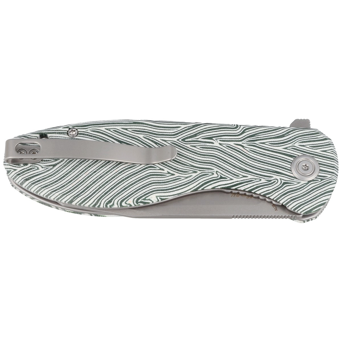 Handle - Damascus G10 (fiberglass compressed with synthetic resin) facings with a unique two-tone pattern. Textured to improve grip confidence, it was bolted to the knife's steel frame. The so-called open-backed design without the typical backspacer, fastened together with steel spacers for easy cleaning. The simple, sturdy design gives assurance of many years of use. Two-position (right/left) steel deep-carry clip allows you to carry the knife discreetly in your pocket in tip-up position (blade tip up). Above the clip a lanyard hole, a hole for threading a safety or decorative cord.