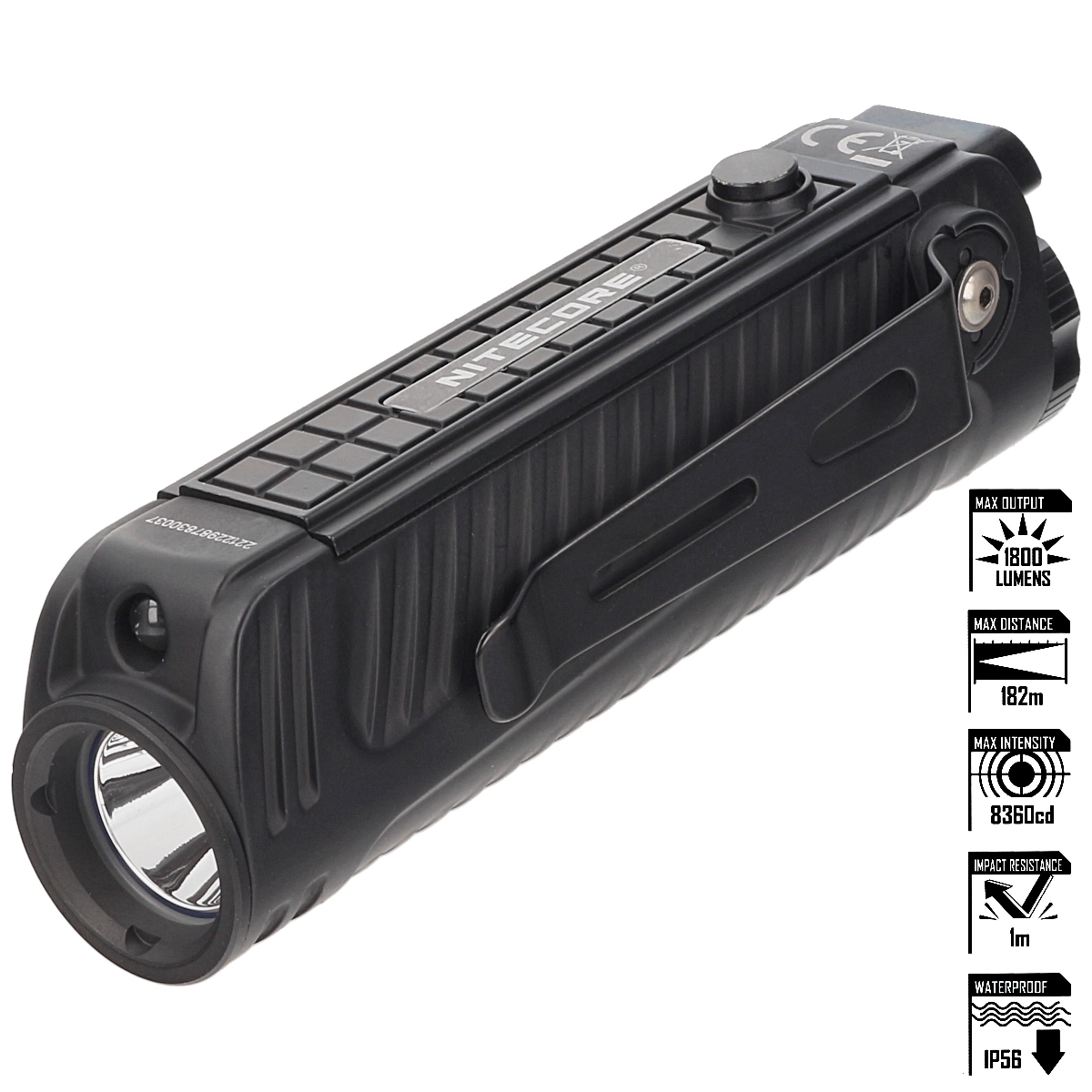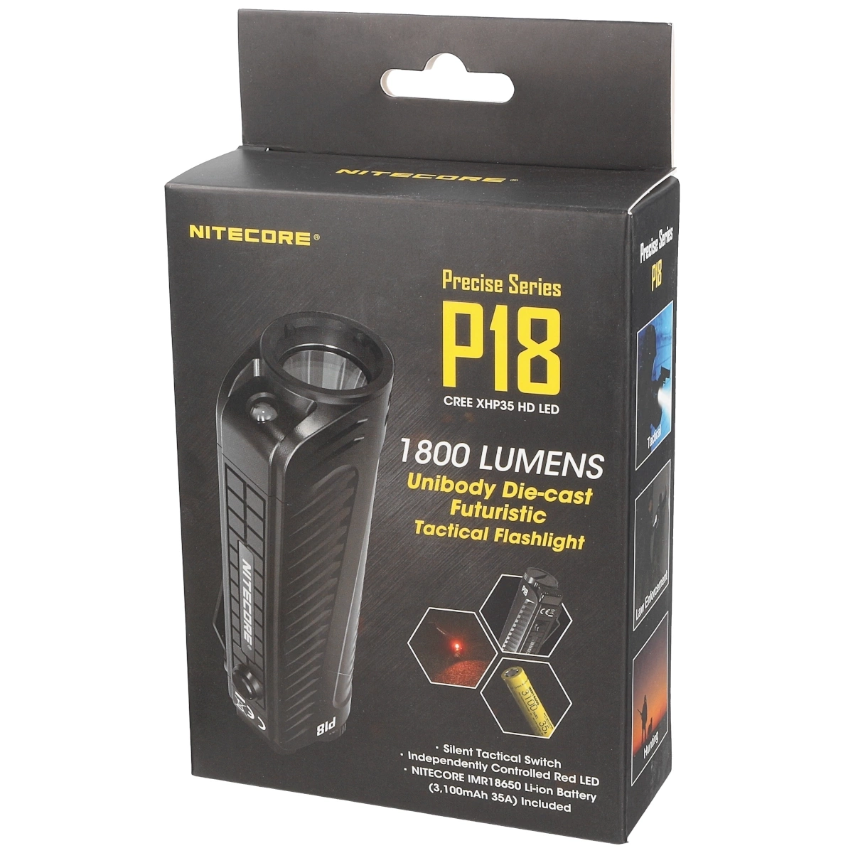 • NiteCore P18 Flashlight takes the Precision series to the next level with its die-cast aluminum, silent switch and red LED. Equipped with a CREE XHP35 HD LED, the P18 is capable of an incredibly high brightness of 1800 lumens!