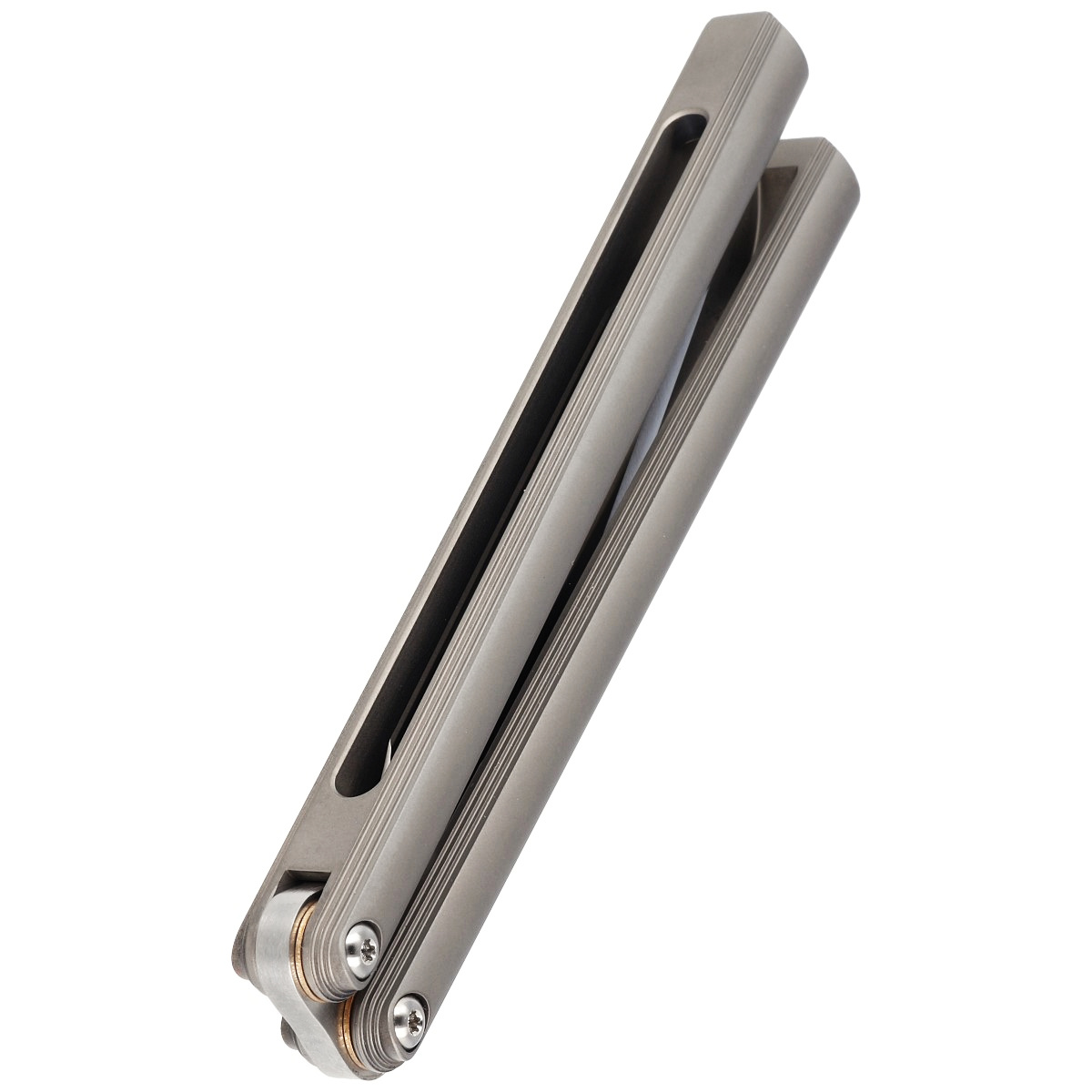 Handle - Bead Blasted titanium grips with a slightly rough texture. Chamfered edges of the covers eliminate sharp edges. Pivot axes set extremely close to each other due to the lack of stop pins. Such a solution allows for much smoother operation, making it easier to perform complex tricks. For the same reason, the designer dispensed with the bar that secures the arms in the open position, on the assumption that the main purpose of his balisong is to provide fun,