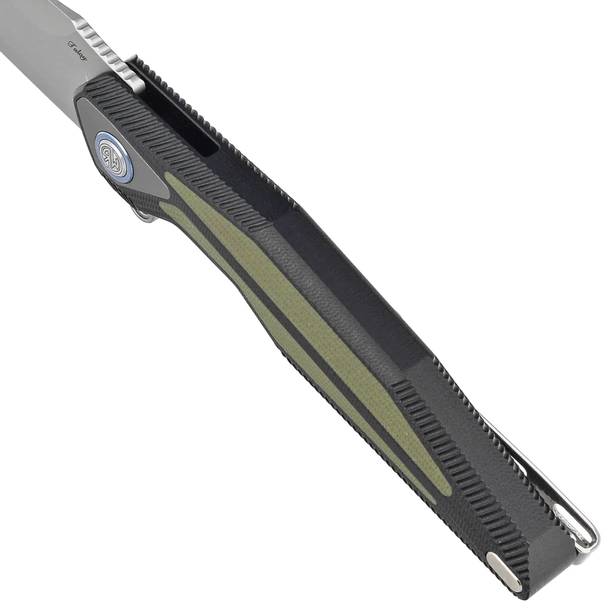 Handle - monolithic, made of a single piece of multi-layer G10 (pressure-pressed fiberglass with synthetic resin) milled with 3D CNC machine tools, along with a perfectly-fitted G10 composite insert in OD Green. This provides incredible durability, but requires the highest level of skill and precision in manufacturing. The cover's chamfered edges and fore finger groove eliminate sharp edges and improve grip ergonomics. The pivot is decorated with a stylized Rike Knife brand logo and a blue titanium circle. A two-position (right/left) deep-carry clip allows you to carry the knife discreetly in your pocket in tip-up position (blade tip up).