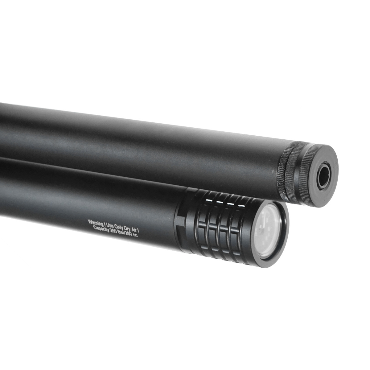 Power supply - compressed air from the under the barrel of the aluminum pressure tank with a capacity 260 cc (air tube bottle), loaded to 250 bar. Fully charged cartridge allows to give from 80 to 125 effective shots depending on the caliber (data for version FAC*). Built-in pressure gauge allows you to control the pressure present in the tank, and thus the degree of its charge. 130 bar minimum working pressure in the cartridge recommended by the manufacturer.