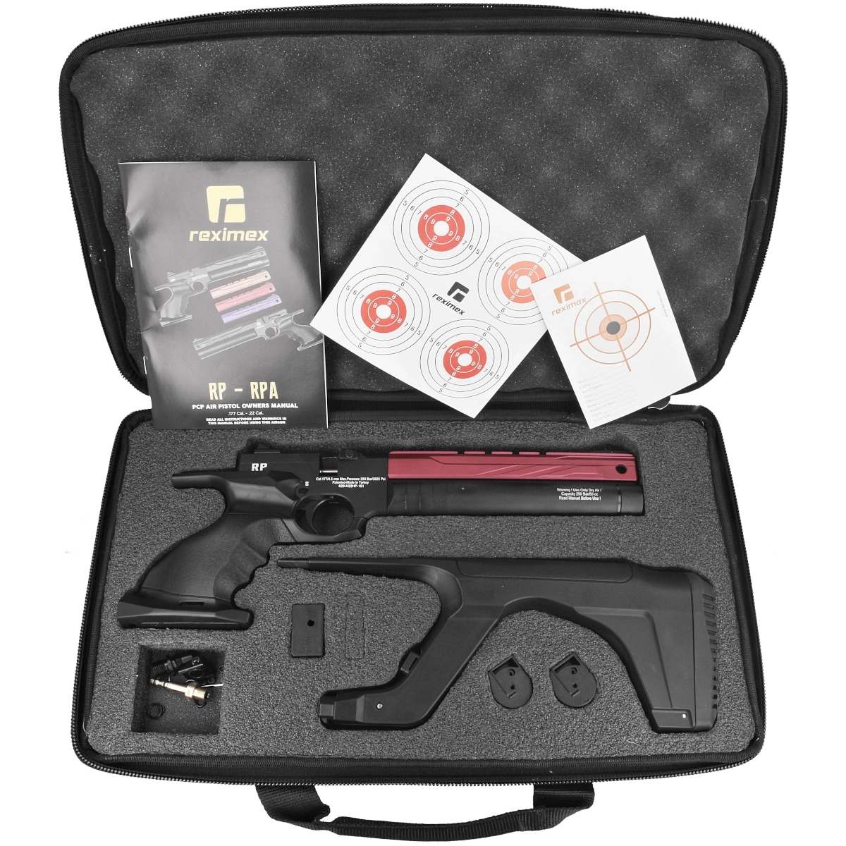 • Reximex RP Red, a sporting PCP pistol with a regulator for repeatable shots. Adjustable pin barrel and trigger tongue. Pressure vessel with a capacity of. 50cc. Anatomical handle with shelf with flask attachment option. Cal. 4.5mm, 5.5mm