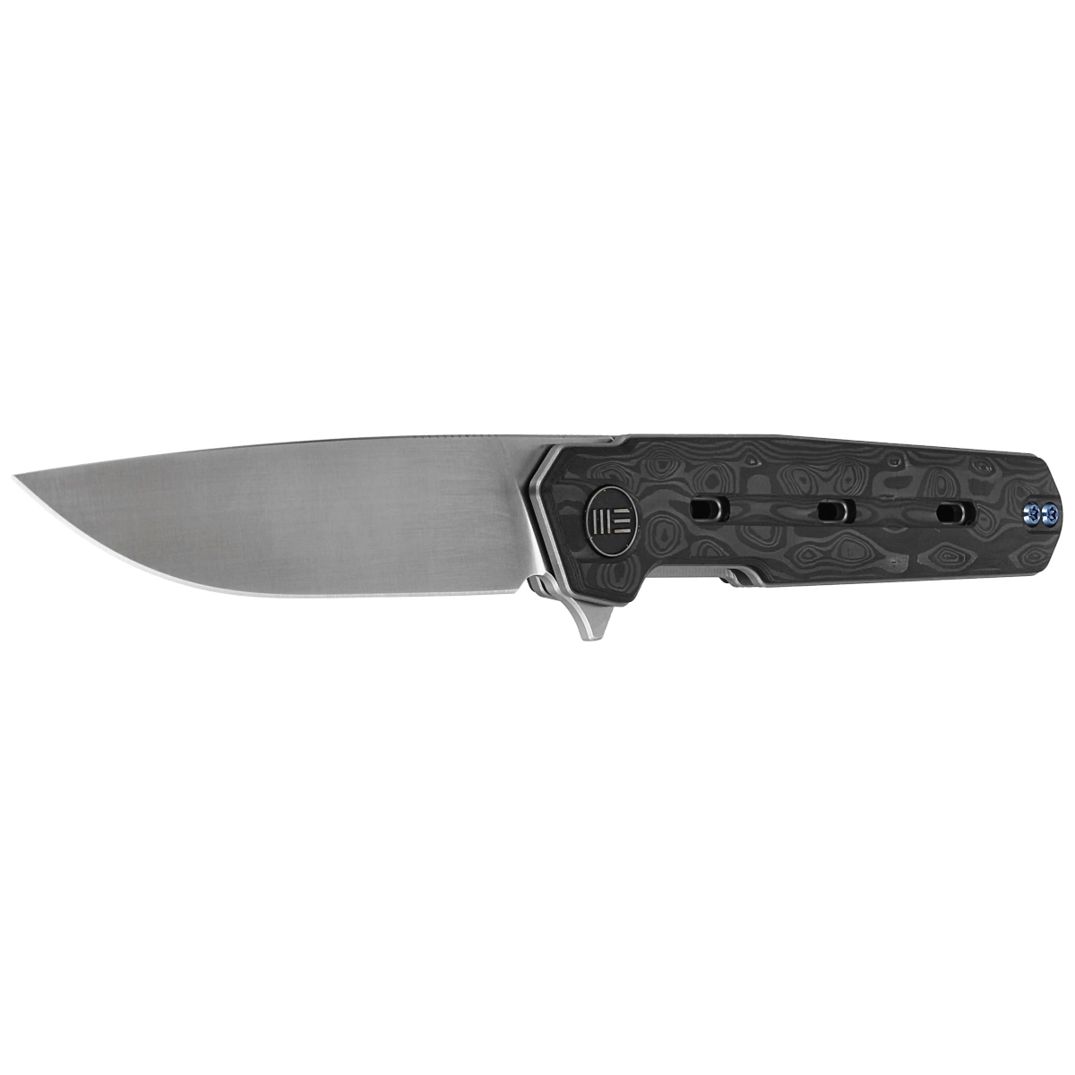 Handle - grips made of Rose Carbon Fiber, (carbon fiber pressed under pressure with synthetic resin) attached to liners made of 6AL4V titanium. Chamfered edges of the liners eliminate sharp edges. The grips are screwed to an intricately machined titanium backspacer, giving assurance of many years of use. The pivot axis is decorated with a stylized WE Knife brand logo. A two-position (right/left) titanium deep-carry clip allows you to carry the knife discreetly in your pocket in the tip-up (blade tip up) position. On the back of the Handle a lanyard hole, hidden in the backspacer, a place for a decorative or safety line.