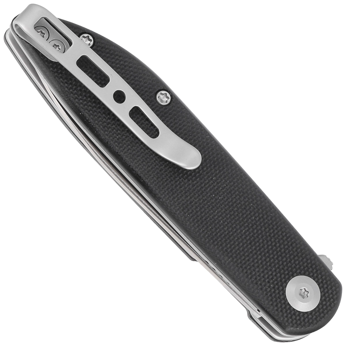 Handle - made of G10, a composite fiberglass material compressed with synthetic resin. The chamfered edges of the covers eliminate sharp edges for comfort, and the jimping made at the front on the liners improves grip security. An open-backed design fixed with steel spacer sleeves reduces weight and facilitates cleaning. A single-position (right) deep-carry clip allows you to carry the knife discreetly in your pocket in tip-up position (tip of the blade upward).
