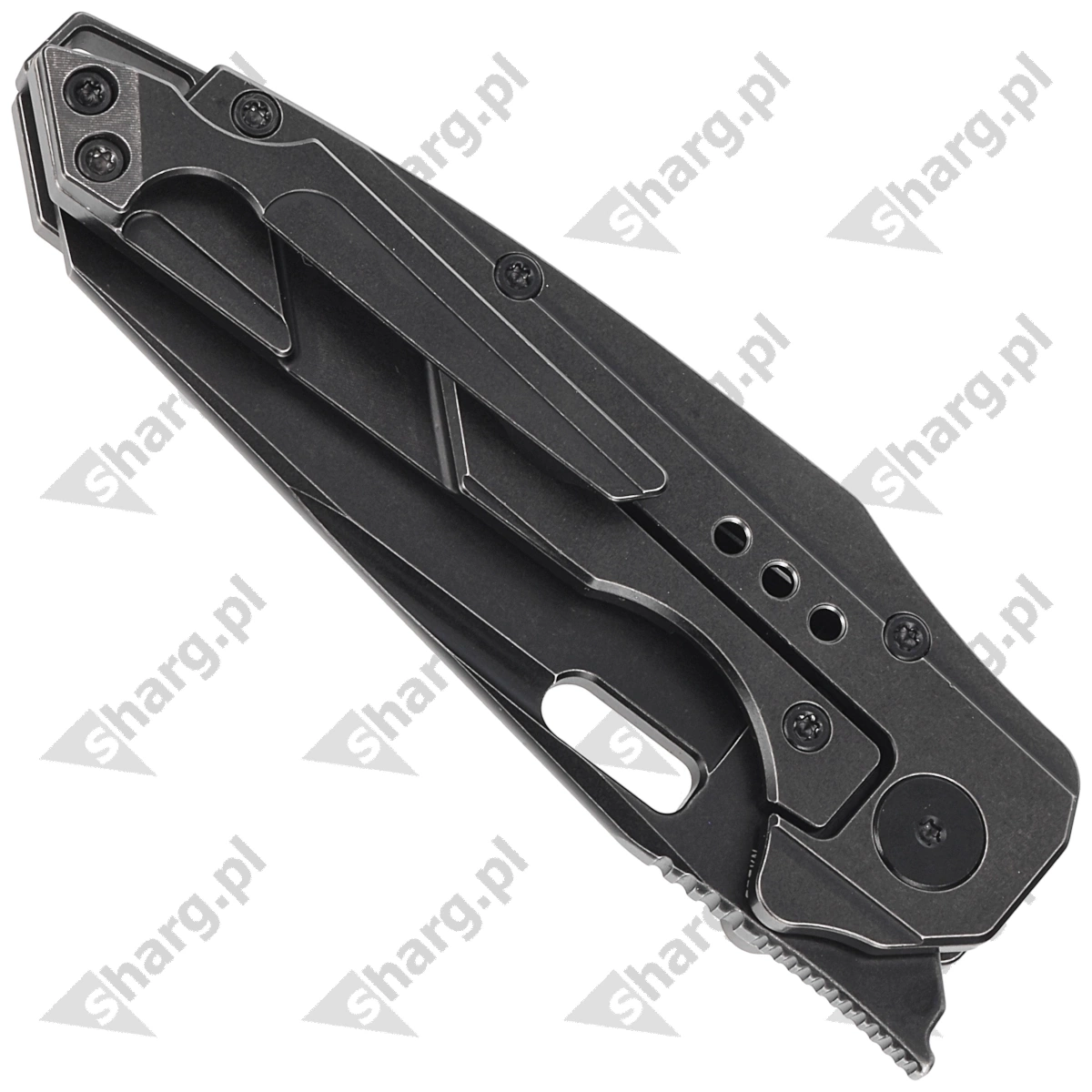 Blade - wide, Reverse Tanto type with a scratch-masking Stonewashed finish, followed by a black coating. The gentle curve of the cutting edge converges toward the needle-sharp tip of the knife. The thickness of the blade provides high strength while the high, flat grind gives excellent cutting edge geometry and extreme cutting performance. Additional reinforcement is provided by the long grain. Ball bearing ceramic supports the opening of the blade with a fast front flipper (index-finger front flipper). We can also open the knife using a hole in the wedge (thumb hole). The whole thing is locked with a proven and popular frame lock with a steel insert to prevent wiping of the lock face.