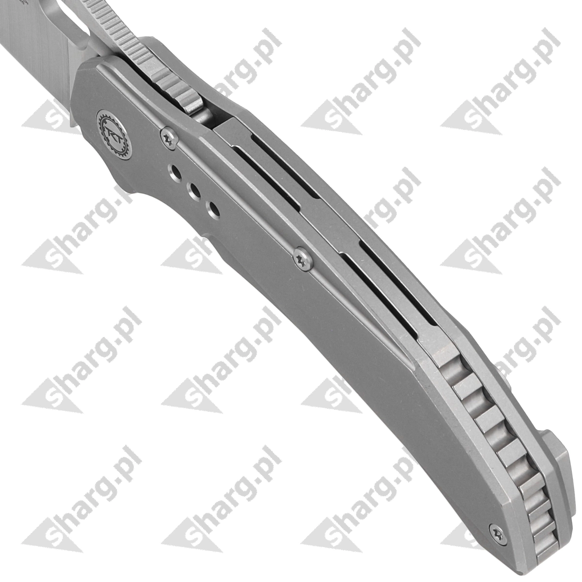 Handle - is two pieces of solid titanium 6AL4V. Chamfered edges of the covers eliminate sharp edges for comfort and improve grip security. The solid titanium backspacer to which the grips are attached guarantees the rigidity and strength of the entire structure. The pivot axis decorated with the logo of the designers, Todd Knife and Tool. A single-position, right-handed titanium clip allows the knife to be carried in tip-up position, with the tip of the blade upward.