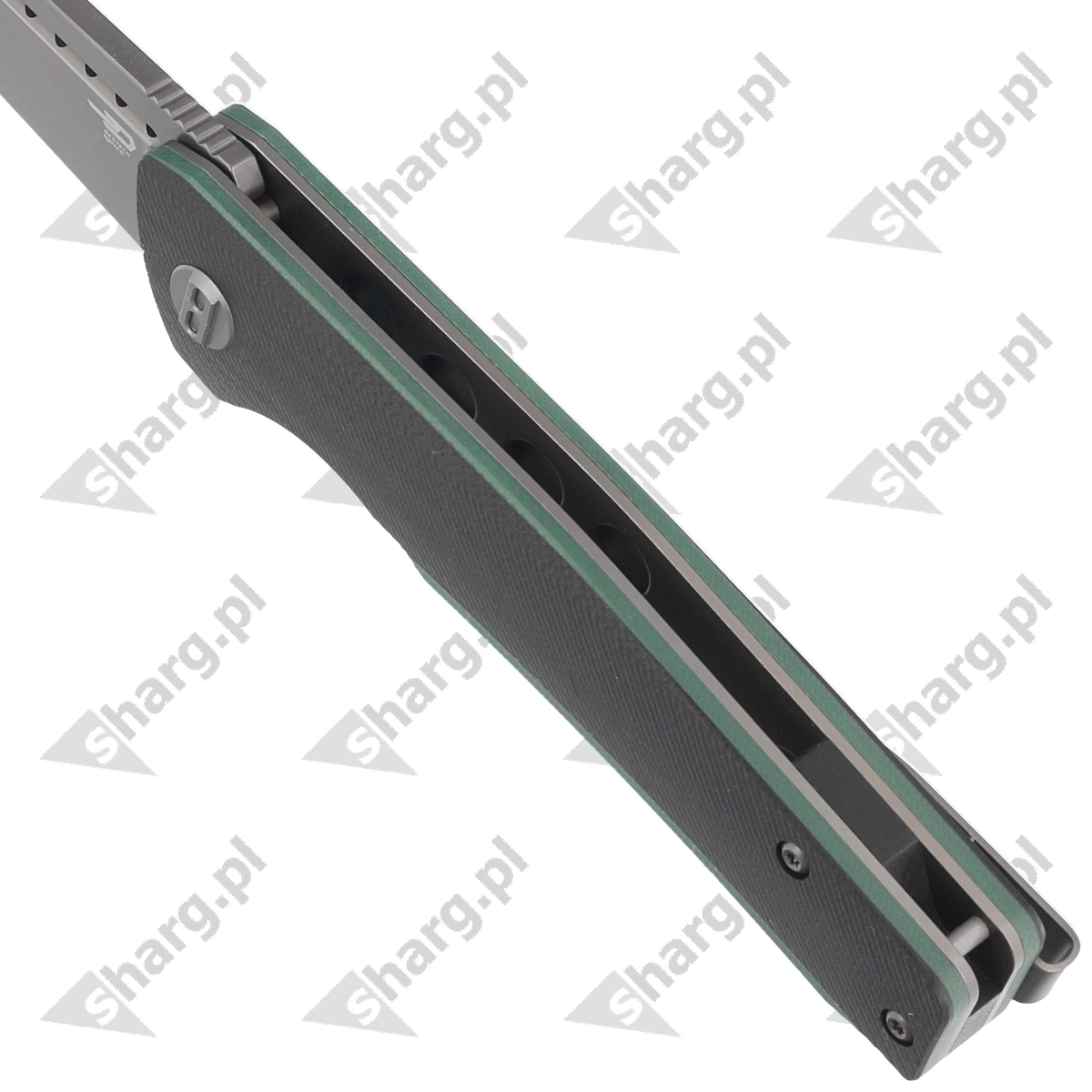 - Slyther Black / Green G10, Grey Titanized, large, slim EDC folder, beautiful blade line and aggressive design. Handle made of G10 material resistant to most external factors, blade made of proven 14C28N stainless steel.