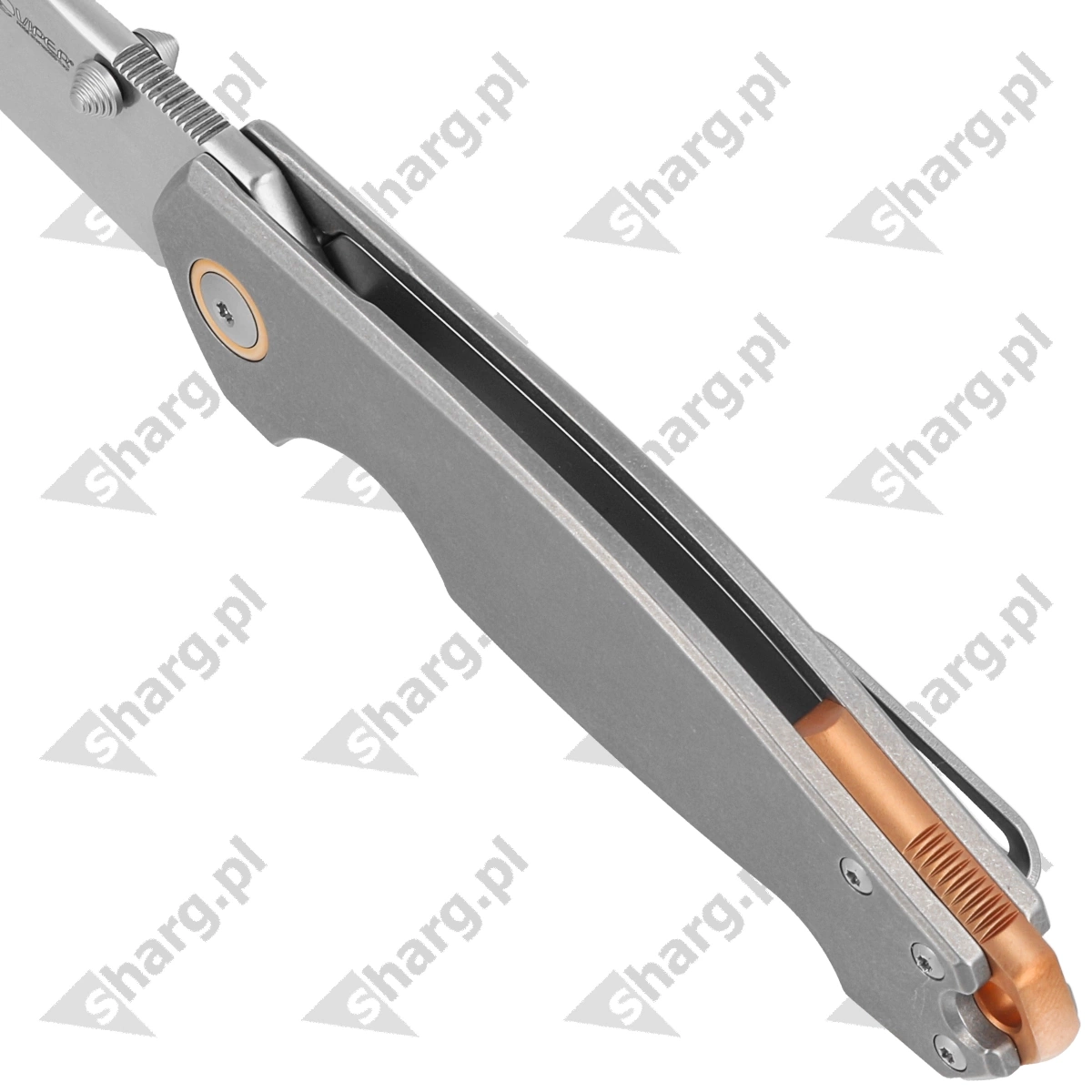 Handle - sandblasted titanium grips joined together using a CNC-milled backspacer, so the knife retains the desired rigidity of construction. The backspacer and the decorative ring around the pivot, the so-called pivot collar, are made of phosphor bronze (phosphor bronze). The fore finger groove, made on the front, improves grip security, while at the same time forming a guard with the flipper to prevent the hand from slipping on the blade. A right-handed, single-position titanium deep-carry clip allows the knife to be carried discreetly in the tip-up (tip up) position. At the end of the Handle lanyard hole, a hole for a cord.