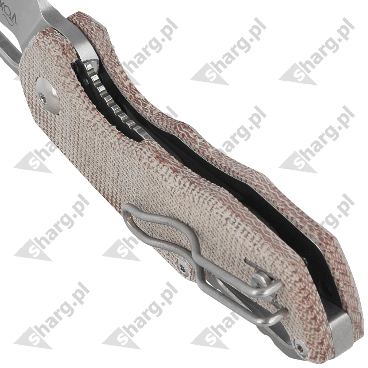 Handle - grips made of CNC-milled Canvas Micarta, a virtually indestructible material insensitive to weather conditions, resistant to chemicals and mechanical damage. Bolted to a carbine-shaped backspacer, deeply textured to improve grip. The backspacer and the decorative ring around the pivot, the so-called pivot collar, are made of titanium. A two-position left/right compact deep-pocket wire clip allows the knife to be carried in tip-up position (blade tip up).