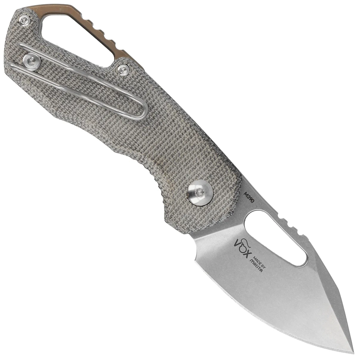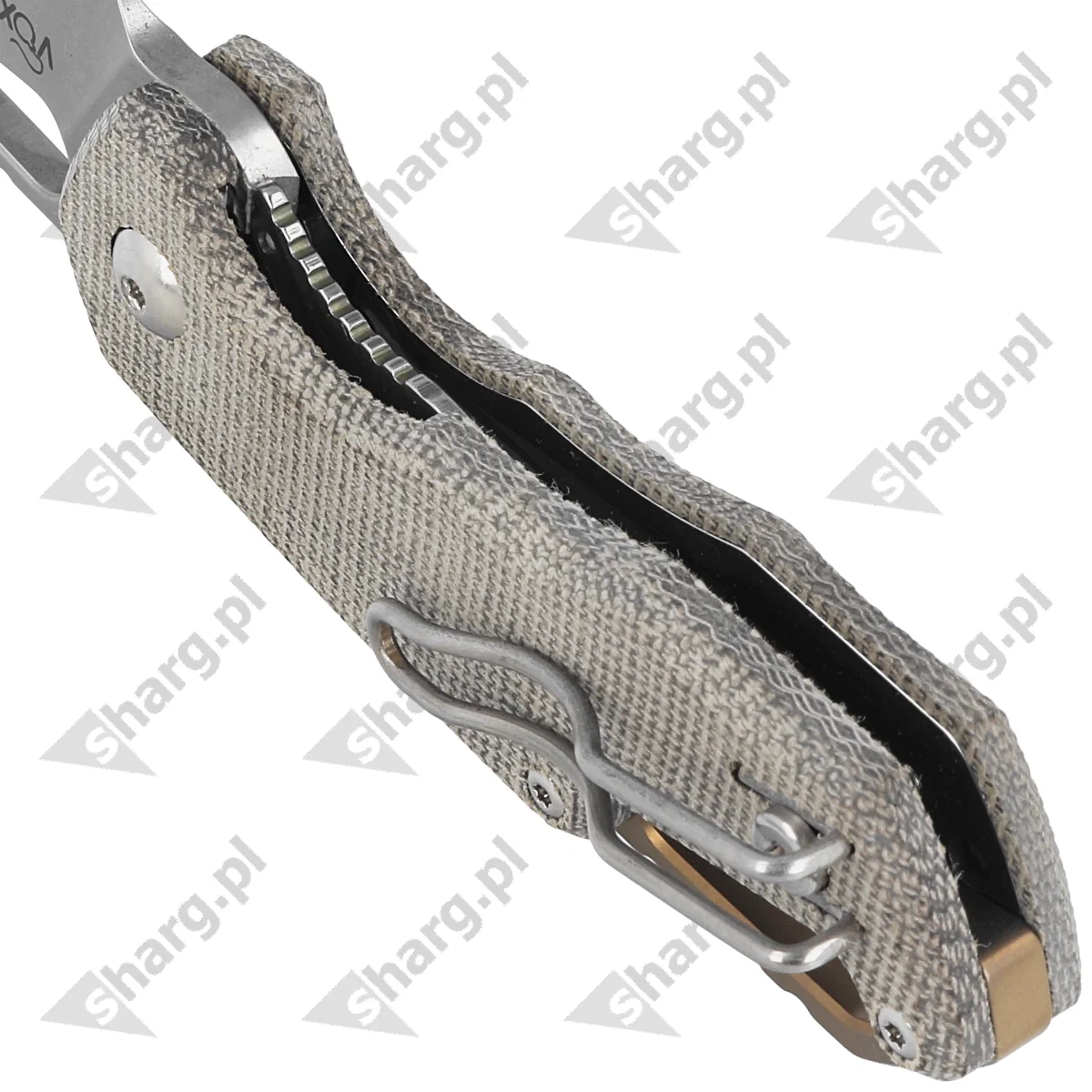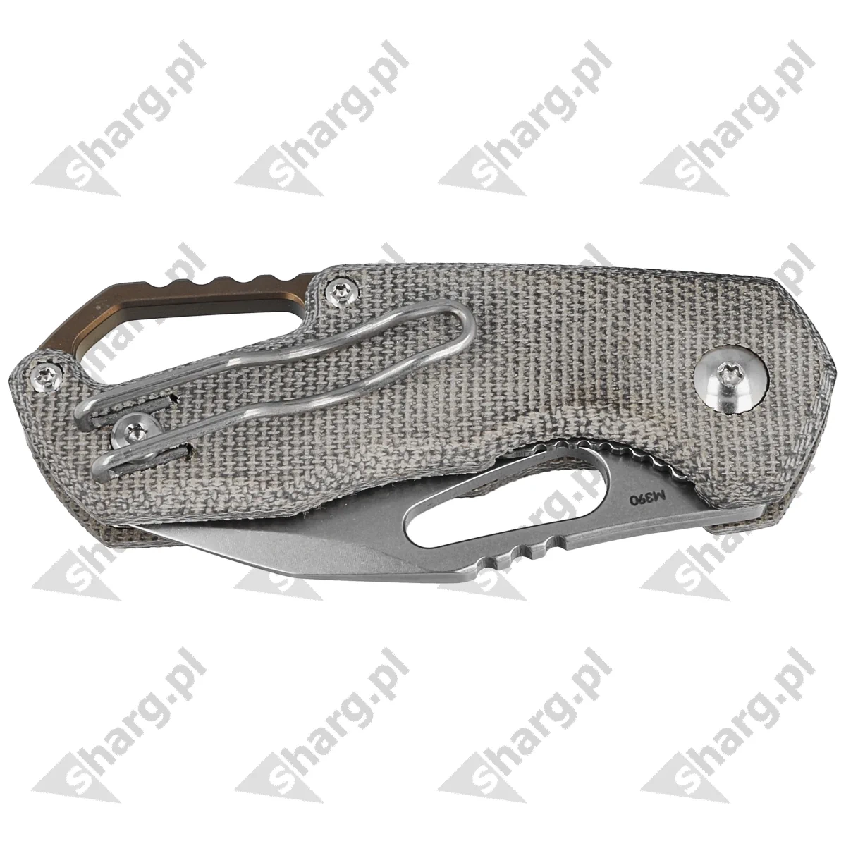 Handle - grips made of CNC-milled Canvas Micarta, a virtually indestructible material insensitive to weather conditions, resistant to chemicals and mechanical damage. Bolted to a carbine-shaped backspacer, deeply textured to improve grip. The backspacer and the decorative ring around the pivot, the so-called pivot collar, are made of bronze anodized titanium. A two-position left/right compact deep-pocket wire clip allows the knife to be carried in tip-up position (blade tip up).