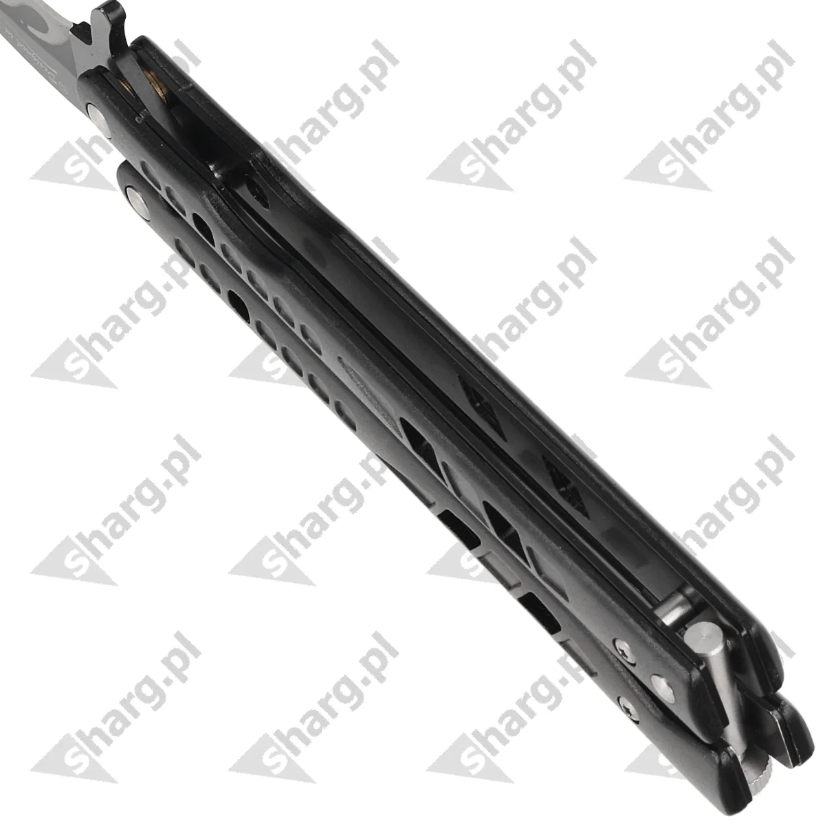 Handle - black-coated aluminium arms on which steel sheaths are mounted. The knurled Handle provides a comfortable, secure grip to facilitate advanced tricks. The blade is locked in place by connecting the arms with the Latchem, a small twist on the back of the Handle that allows the arms of the Handle to be locked in both the open and closed positions.