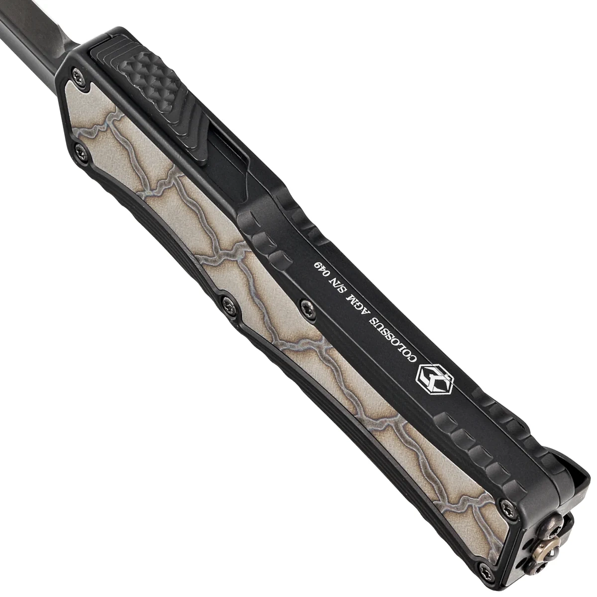 Custom Colossus S/N 049 and date 2/23, has a secure place in the Heretic Knives OTF line of automatic knives. The mechanism, which operates with great strength and power, uses a patent-pending slide action. Ball bearings used reduce friction for fast, smooth blade locking. Grip enhancing inserts on both sides of the Handle give remarkable style as well as functionality. The double-sided clip makes this an ideal knife for right- or left-handed users.