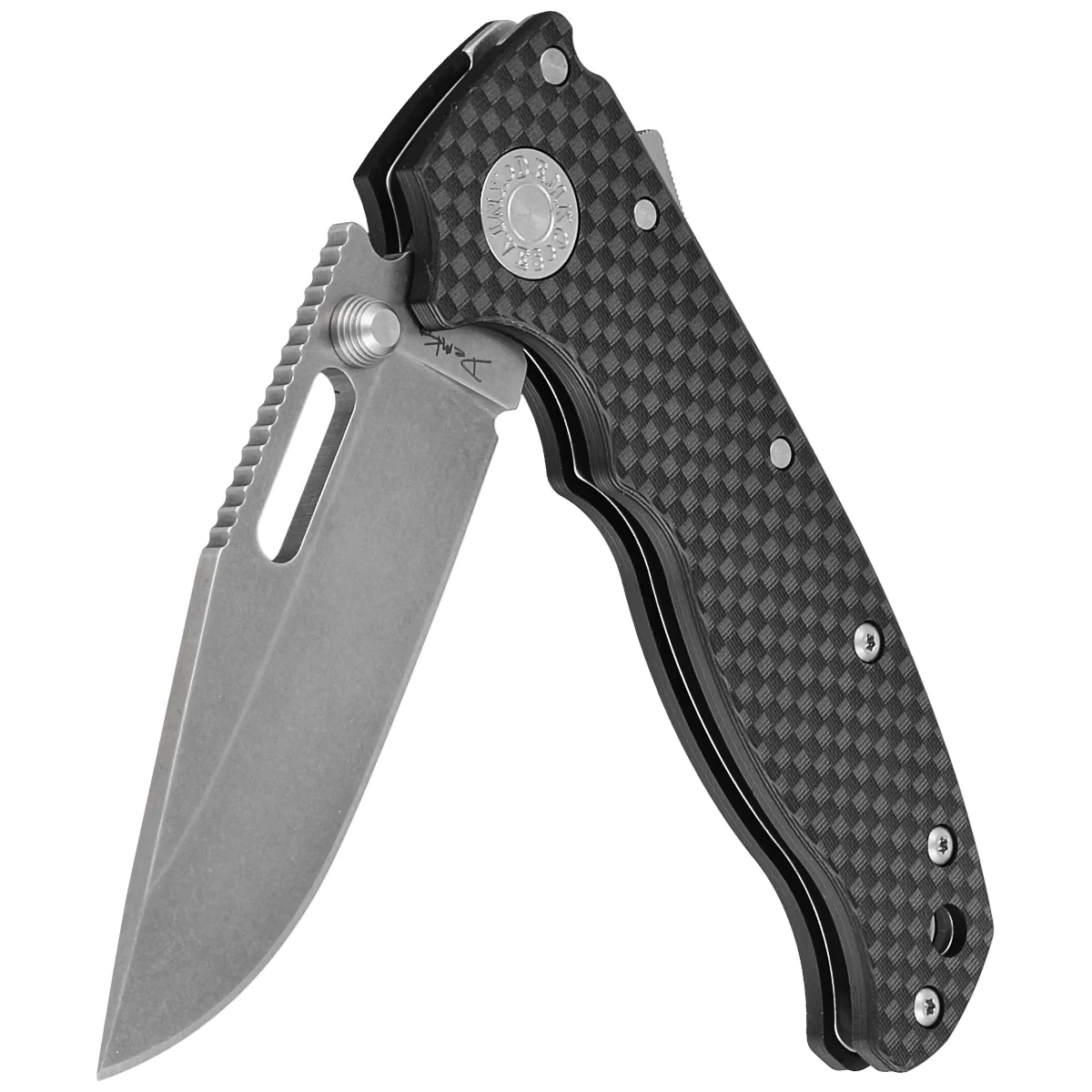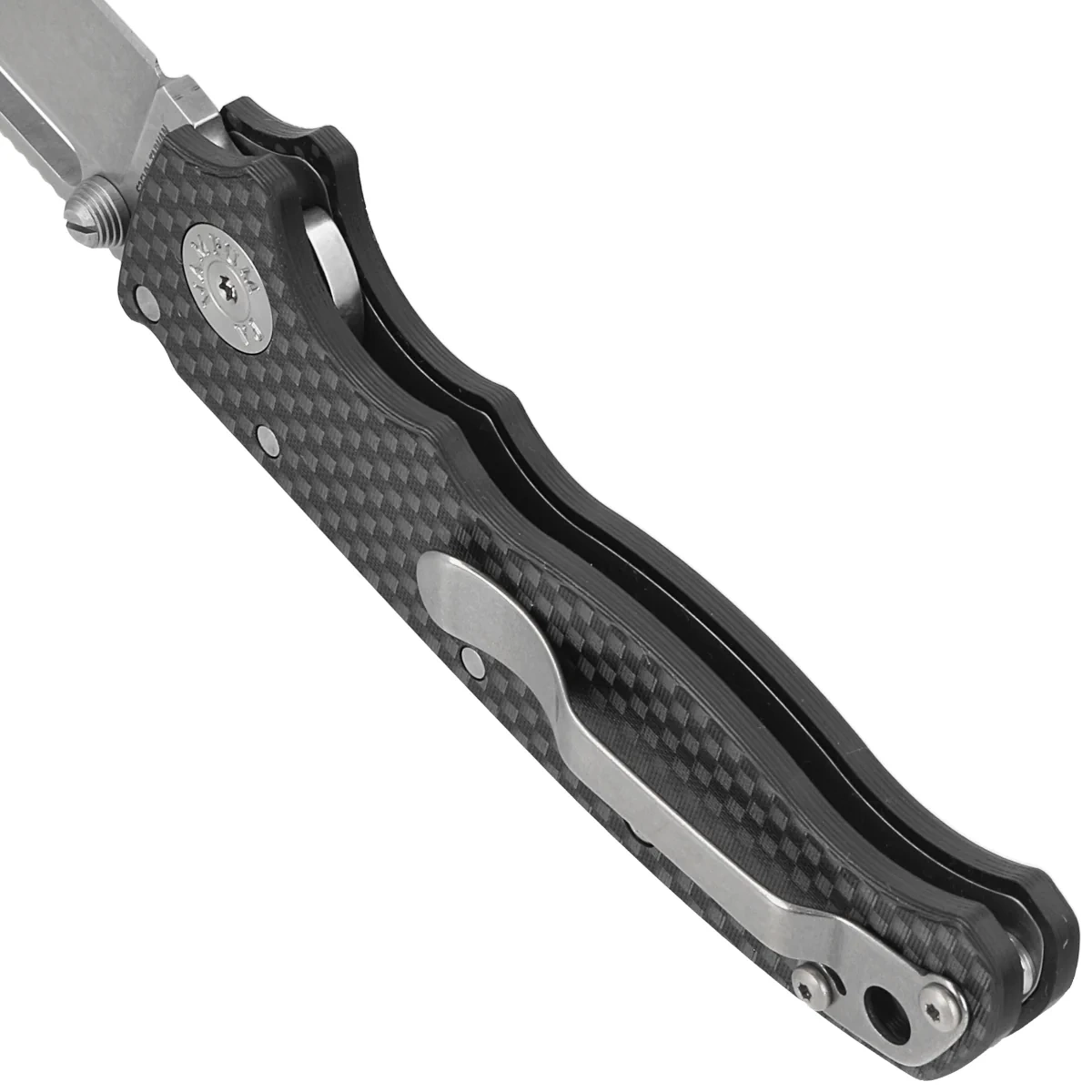 Handle - grips made of Carbon Fiber, a virtually indestructible plastic that is insensitive to weather conditions, resistant to chemicals and mechanical damage. Chamfered edges of the covers eliminate sharp edges and distinctive surface texturing improves grip confidence. A single-position, right-handed clip allows the knife to be carried in the tip-up position, with the tip of the blade upward. A left-handed clip is included.