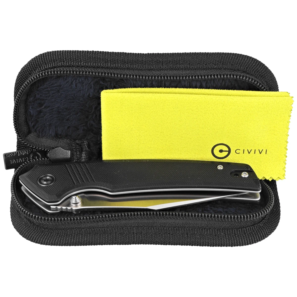 Handle - made of G10, a composite fibreglass material compressed with synthetic resin. The chamfered edges of the covers eliminate sharp edges and the textured surface increases comfort and grip. The open-backed design, fixed with steel spacer sleeves, reduces weight and facilitates cleaning. The pivot is decorated with a stylised Civivi brand logo. The two-position, right/left deep carry clip allows the knife to be carried discreetly in the pocket in the tip-up position (blade tip upwards).