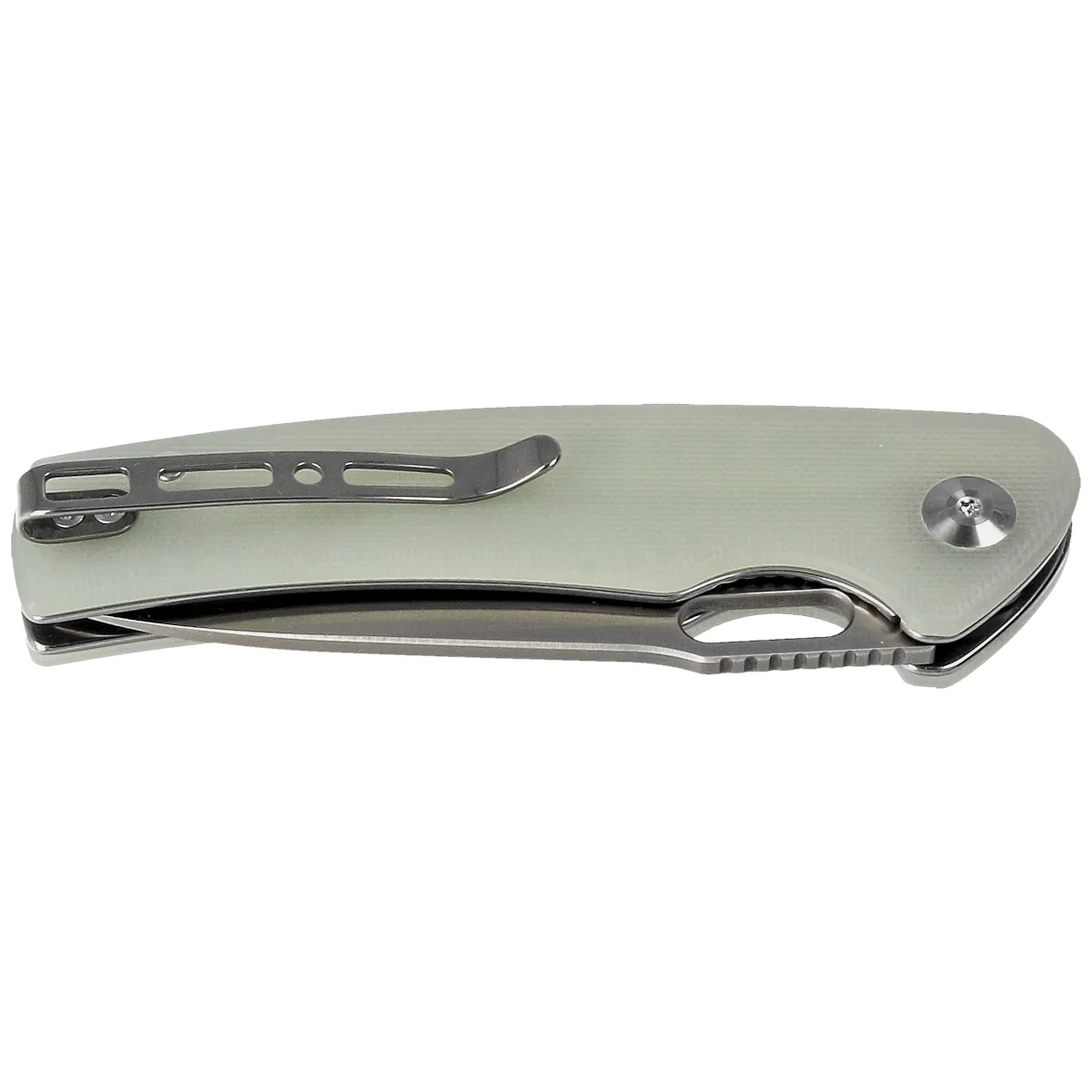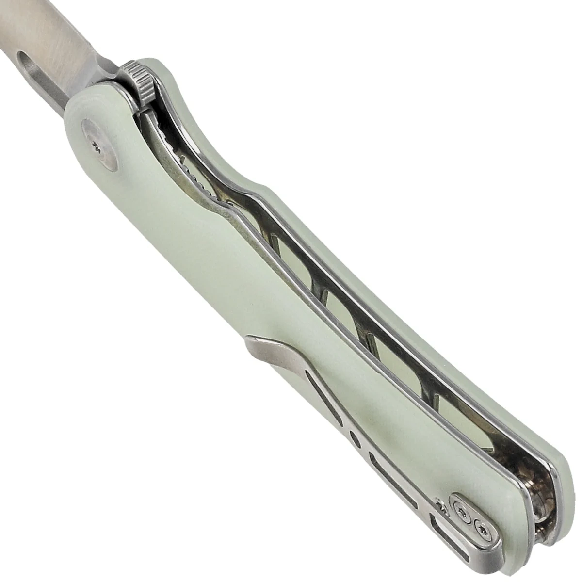 Handle - made of G10, a composite fibreglass material compressed with synthetic resin. Chamfered cover edges eliminate sharp edges for comfort and a fore finger groove improves grip security. The open-backed design, fixed with steel spacer sleeves, reduces weight and facilitates cleaning. The two-position right/left deep carry clip allows the knife to be carried discreetly in the pocket in the tip-up position (blade tip upwards).