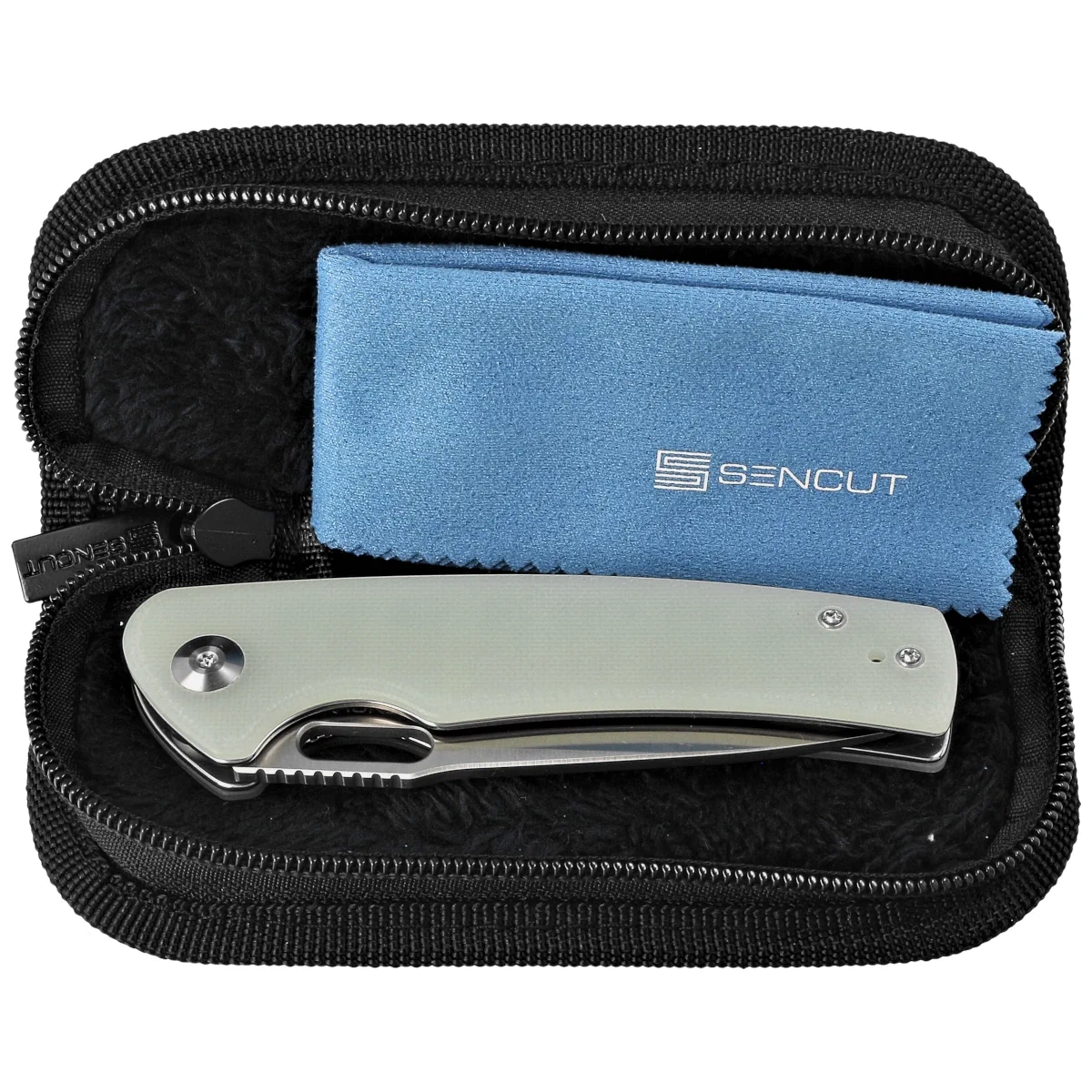 Case - the knife is packaged in a zipped soft nylon case with the brand logo. It is used to safely store and transport the folder.