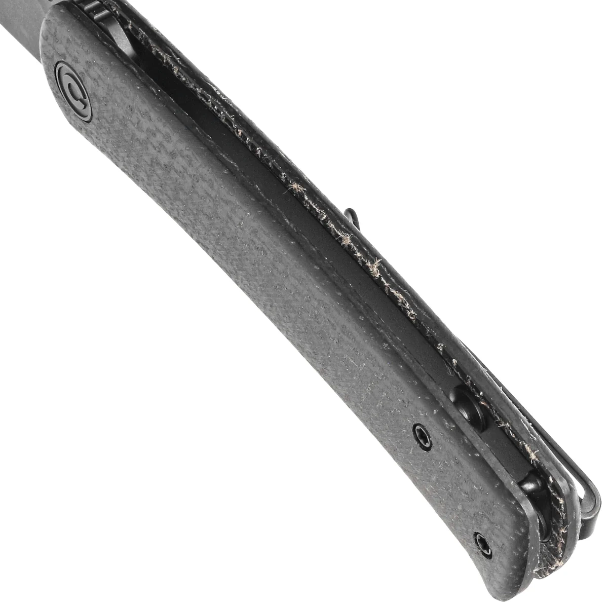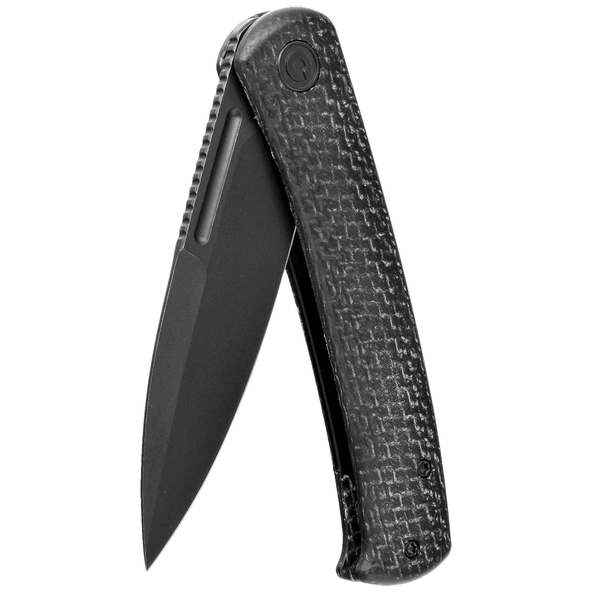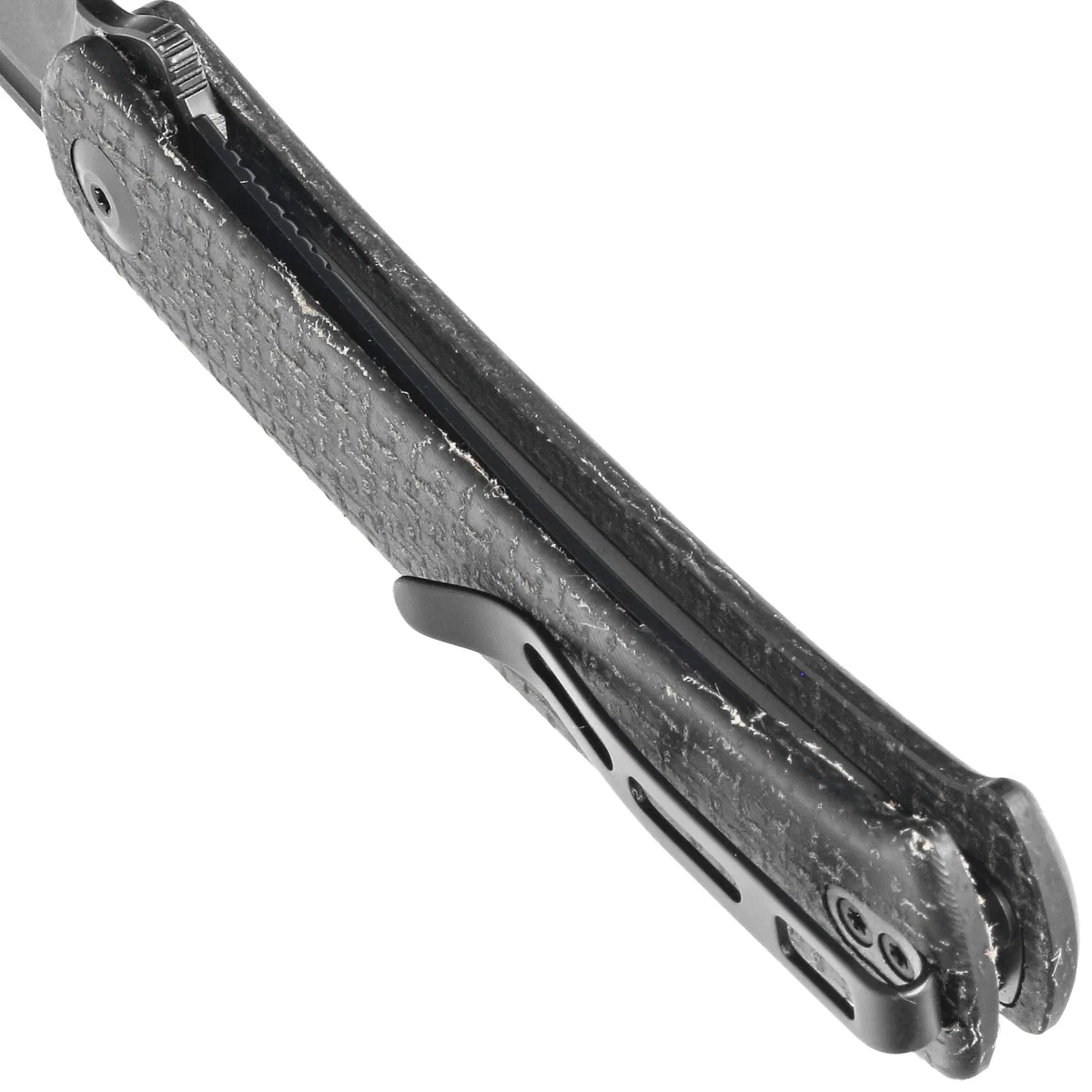 Handle - Burlap Micarta plastic grips, pressure-pressed jute fabric with synthetic resin. Chamfered cover edges eliminate sharp edges for comfortable grip. An open-backed design fixed with steel spacer sleeves reduces weight and facilitates cleaning. The pivot axis is decorated with a stylized Civivi brand logo. A single-position, right-side deep-carry clip allows you to carry the knife discreetly in your pocket in tip-up position (blade tip up).