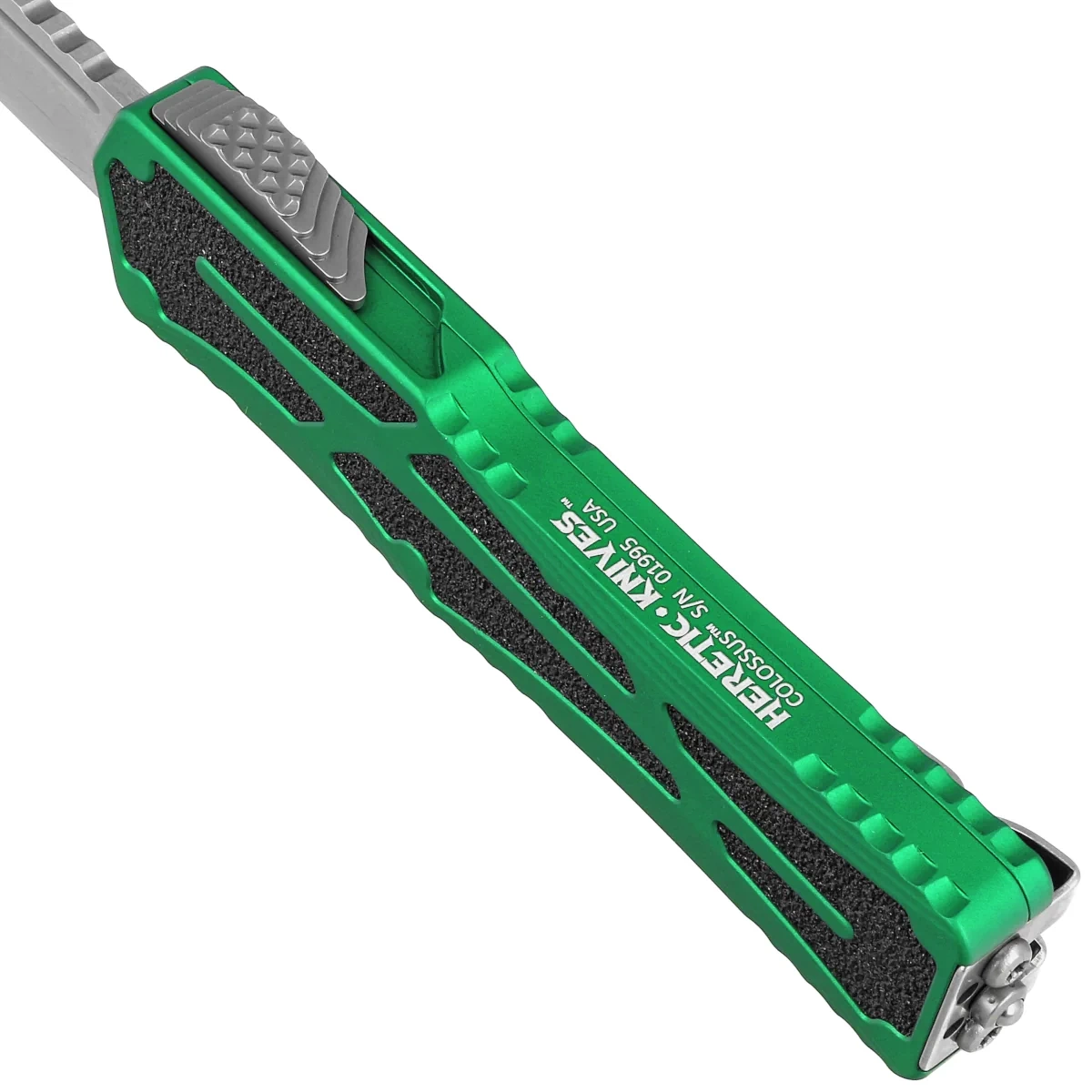 Colossus TE Green Aluminium, Stonewashed one of the best OTF (Out The Front) automatic knives. It features the excellent fit and finish you would expect from a top of the range knife. The over-the-top automatic operates in D/A (Double Action) mode using a powerful and forceful, patent-pending knife opening mechanism. The mechanism uses ball bearings to reduce friction and ensure fast, smooth blade locking. Grip enhancing inserts on both sides of the aluminium Handle provide both style and functionality. Designed by Anthony Marfione Jr. owner of Heretic Knives.