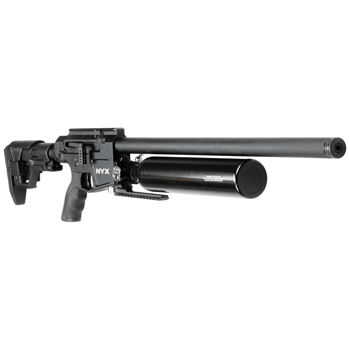 - Reximex NYX, modern tactical multi-shot PCP rifle with Side Lever reloading, regulator, fully adjustable AR telescopic stock and barrel with integrated moderator. Available in calibers: 4.5mm, 5.5mm, 6.35mm