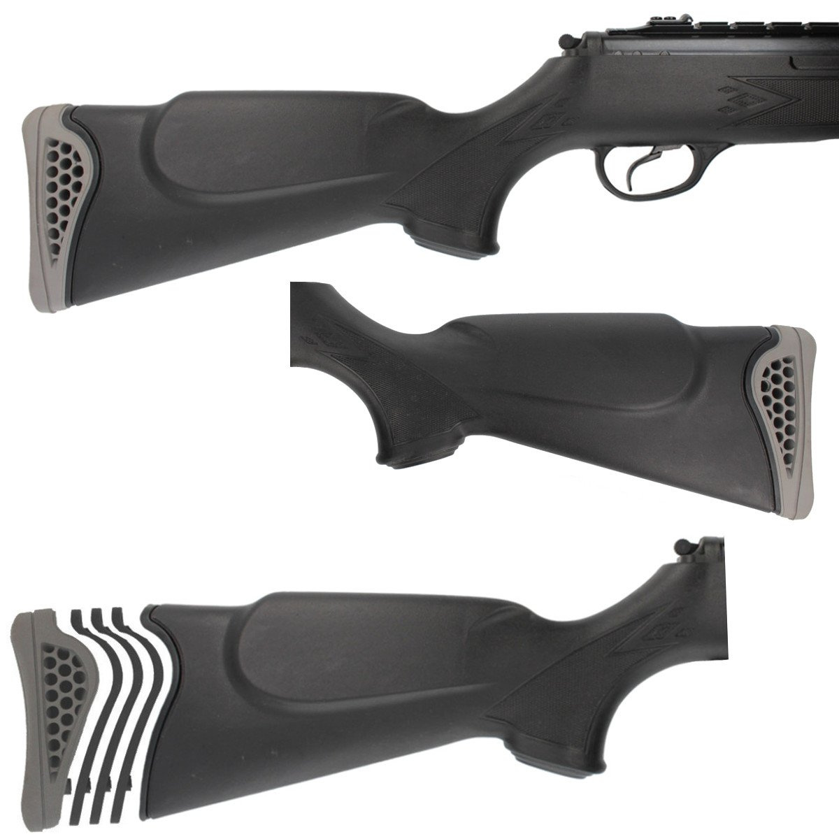 Stock - ergonomic and ambidextrous, designed for both right and left-handed shooters. Constructed from durable black polymer. The checkering on the pistol grip and fore-end ensures a firm hold and adds a decorative touch. The Monte Carlo cheekpiece is contoured for easier aiming and shooting. The stock is finished with a ventilated rubber TrioPad® butt plate that absorbs recoil energy after firing. The set includes three additional spacer pads to adjust the stock length to fit the shooter's build.