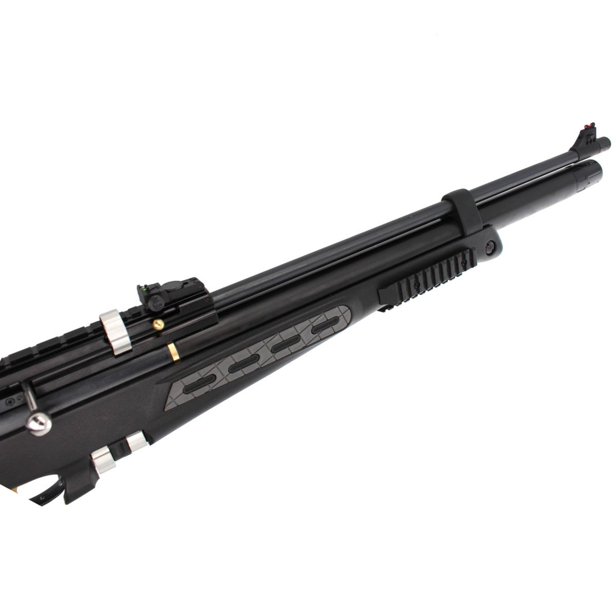 Szyna montażowa - wersja taktyczna wiatrówki z podwójną szyną montażową 11 mm / 22 mm, pozwala na montaż dowolnego celownika optycznego. Szyna zgodna ze standardem MIL-STD 1913 (zwana picatinny lub Weaver). Dodatkowe trzy szyny zgodne ze standardem picatinny na chwycie osady.