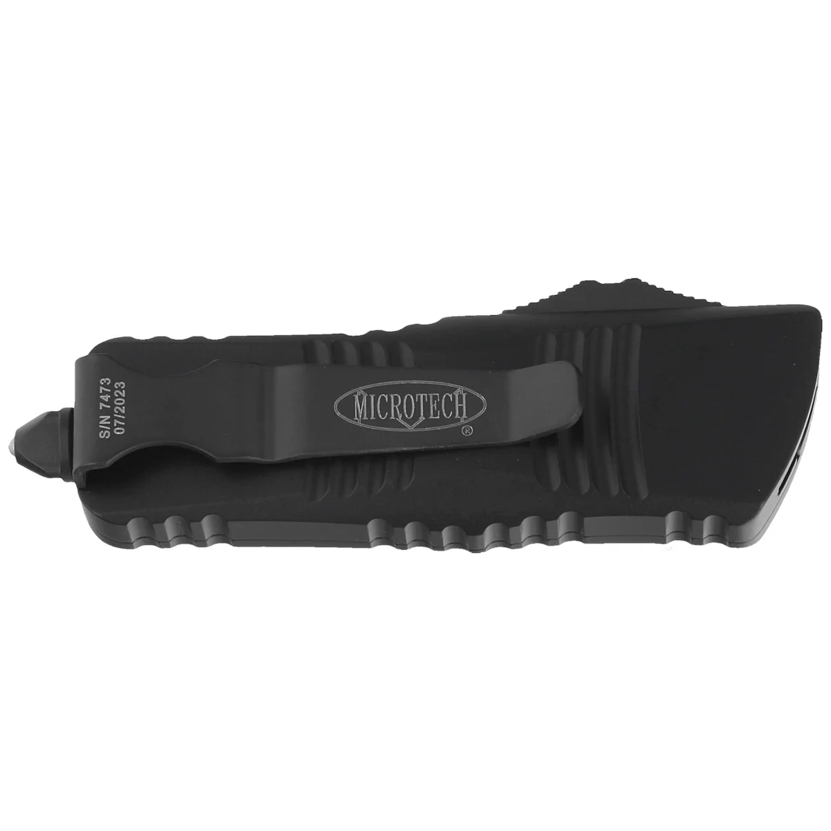 Handle - made with excellent precision in 3D technology on CNC milling machines, from black anodized 6061-T6 aluminum. The surface texture of the Handle and the deep notches (jimping) on it make the knife non-slip in the hand during use. The slim profile and the milled two-position (right/left) solid deep-carry clip allow the knife to be carried discreetly in the pocket, in tip-down (blade tip down) position. The clip bears the Microtech logo, serial number and production date. The Handle is finished with a glass breaker, a solid steel triangle, into which a tungsten carbide ball has been pressed. It also features a hole for interweaving a decorative cord.