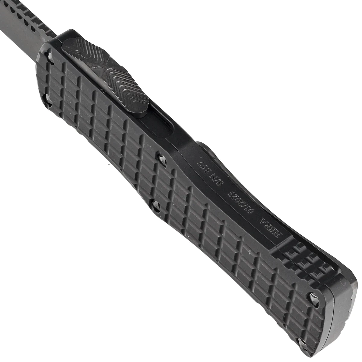 Hera S/E Frag Signature Black Aluminum Shadow, Black DLC one of the best and versatile OTF (Out The Front) automatic knives. Modeled after the iconic Troodon automatic, it is an intermediate link between EDC and tactical models. The over-the-top automatic operates in D/A (Double Action) mode using an opening mechanism that works with great force and power. This model features an excellent fit and superb finish. Designed by Anthony Marfione knifemaker and owner of Microtech Knives.