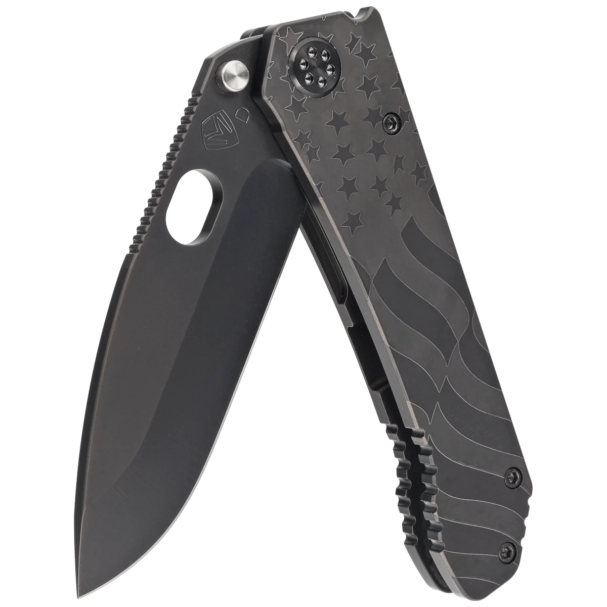 Handle - made of solid titanium coated black PVD has been personalized (custom) by adding a discreet graphic on the presentation side, an American flag motif called "Ghosted Flag" by the manufacturer. The so-called open-backed design without the typical backspacer, attached to each other with spacer sleeves for easy cleaning. Simple and reliable construction. The whole is complemented by a massive clip, of course, also made of titanium whose edges have been finished with black PVD coating, and the flat part anodized bronze.
