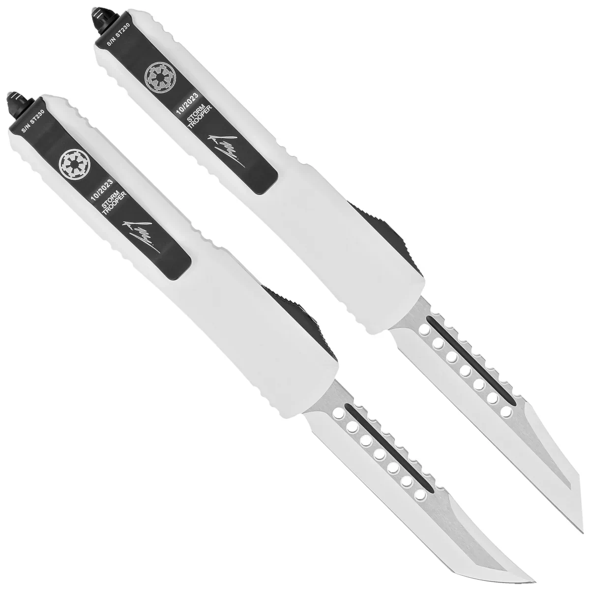 Ultratech Storm Trooper Hellhound & Warhound White, a set awarded for 25 years of service to the Empire! Only a few storm troopers have survived long enough to get one! The set includes the Ultratech S/E OTF knife Warhound and OTF knife Hellhound Signature Storm Trooper White Aluminum, White from the Signature Series line. These are full-size OTF (Out The Front) automatic knives from the Ultratech series. Operating in D/A mode, they feature a hellishly fast blade extension mechanism. 100% made and assembled in the USA. Designed by Anthony Marfione, knifemaker and owner of Microtech Knives.