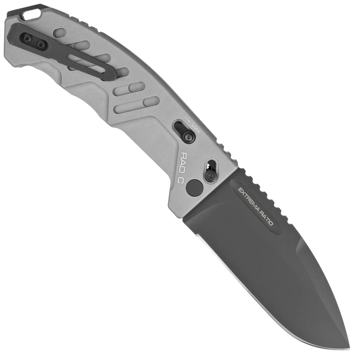 RAO C Tactical Grey Aluminum, Black, a compact version of the legendary Extrema Ratio RAO knife, which was developed for the paratroop reconnaissance regiment "185° Rgt. Ricognizione e Acquisizione Obiettivi" (185° RAO). Smaller dimensions translate into more comfortable carrying. Bolt Lock and lock turns the folder into a fixed blade knife.