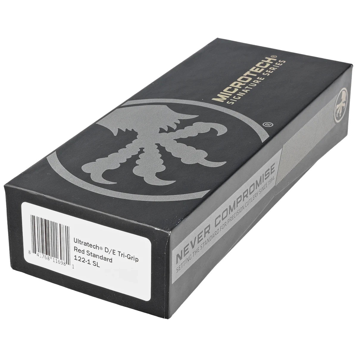 Ultratech D/E Sith Lord Signature Tri-Grip Black Aluminum, Red a full-sized OTF (Out The Front) automatic knife from the Ultratech Signature Series, with a handle as black as a Sith Lord's soul and a dagger blade as red as his lightsaber. Operating in D/A mode, it features a lightning-fast blade deployment mechanism. 100% made and assembled in the USA. Designed by Anthony Marfione, knifemaker and owner of Microtech Knives.
