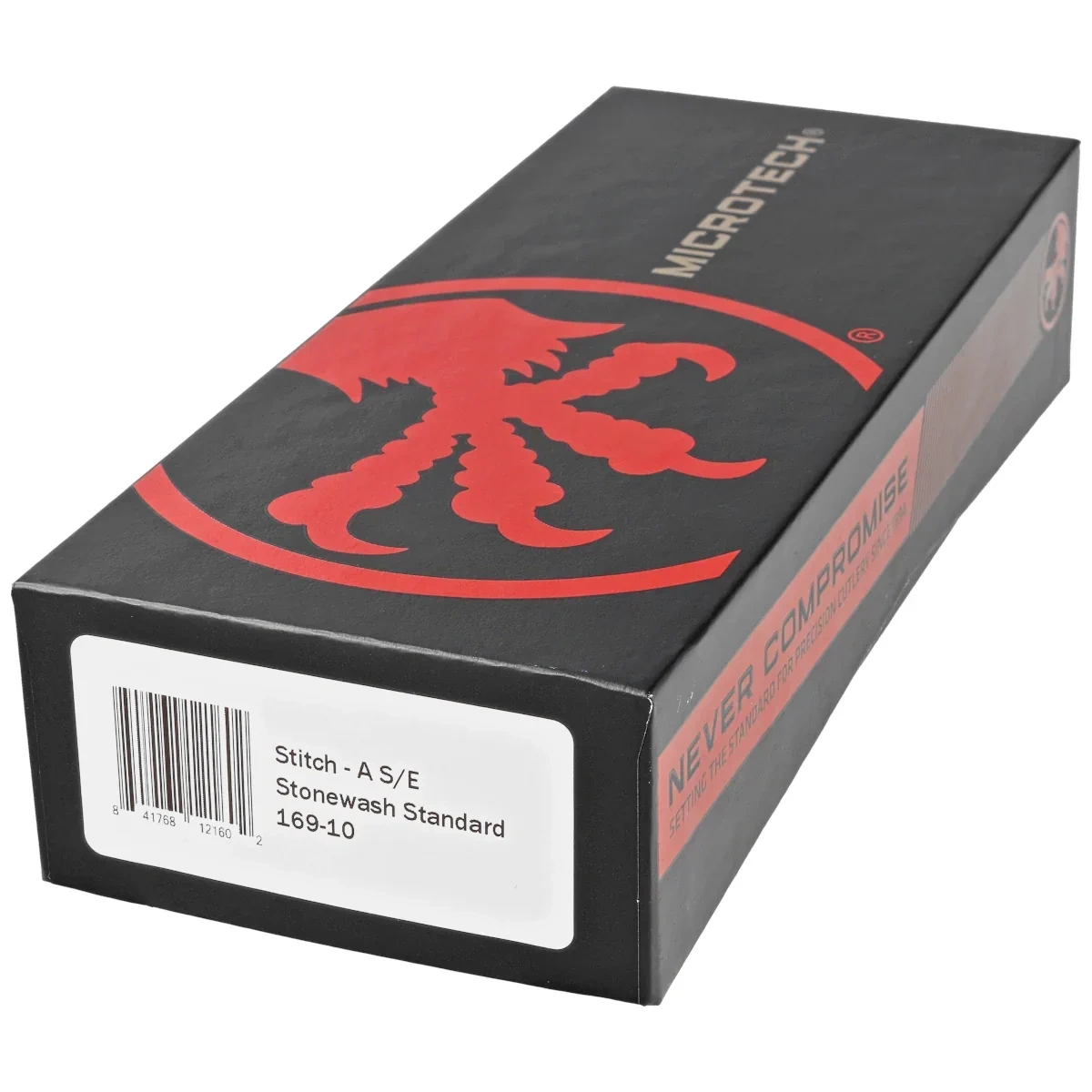 Stitch S/E Black Aluminum, Stonewash bold design of a versatile automatic knife, the result of a collaboration between Sebastijan Berenji and Microtech. A wide Blade and a simple handle, comfortable in every grip, give a strong tactical knife made with attention to the finest details and from the best materials. A faithful companion that will never disappoint