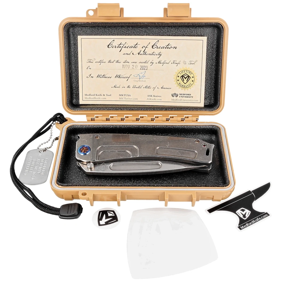 • Marauder-H Drop Point, Tumbled Titanium, Flamed HW/Clip, NP3 Breaker, Tumbled. A large, extremely powerful folding knife designed by Greg Medford of Medford Knife & Tool in tribute to the A-26 Marauder bomber that was known for its incredible firepower!