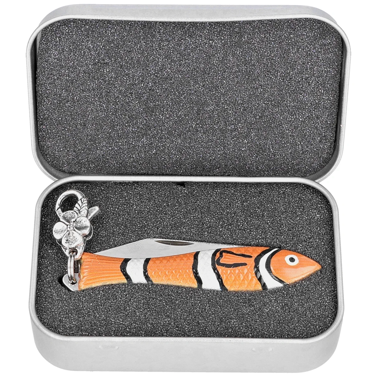 Handle - tang covers in the shape of fish scales cast in zinc alloy, decorated with the graphic motif of Clown fish (Clown) from the movie "Where is Nemo?", made with the new UV LED printing technology. In the back of the grips an eyelet that allows you to attach the knife to a key ring with a bunch of keys.