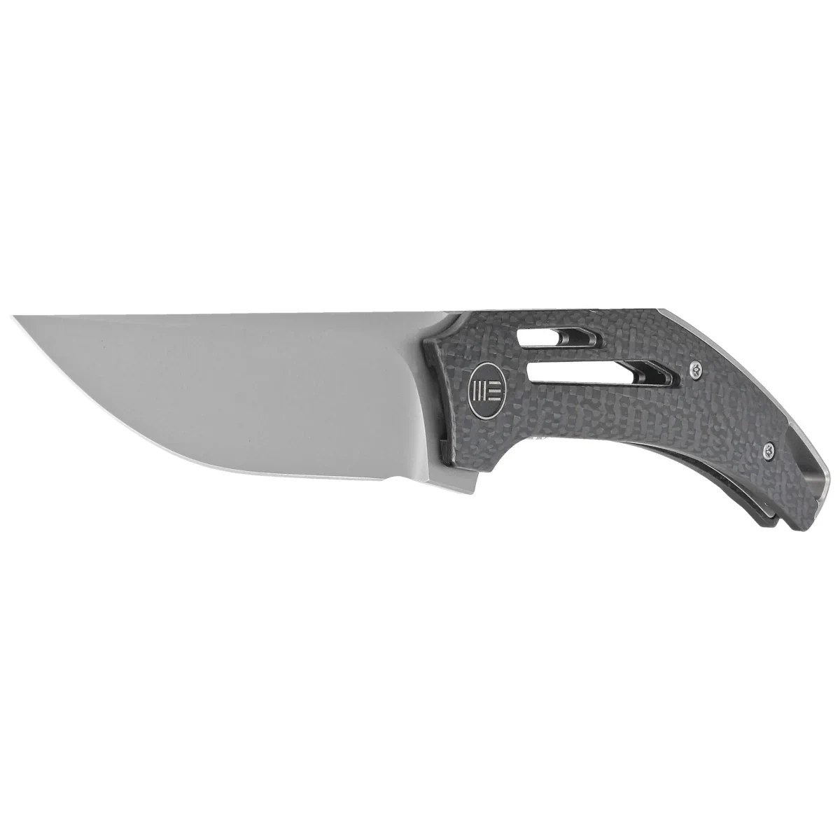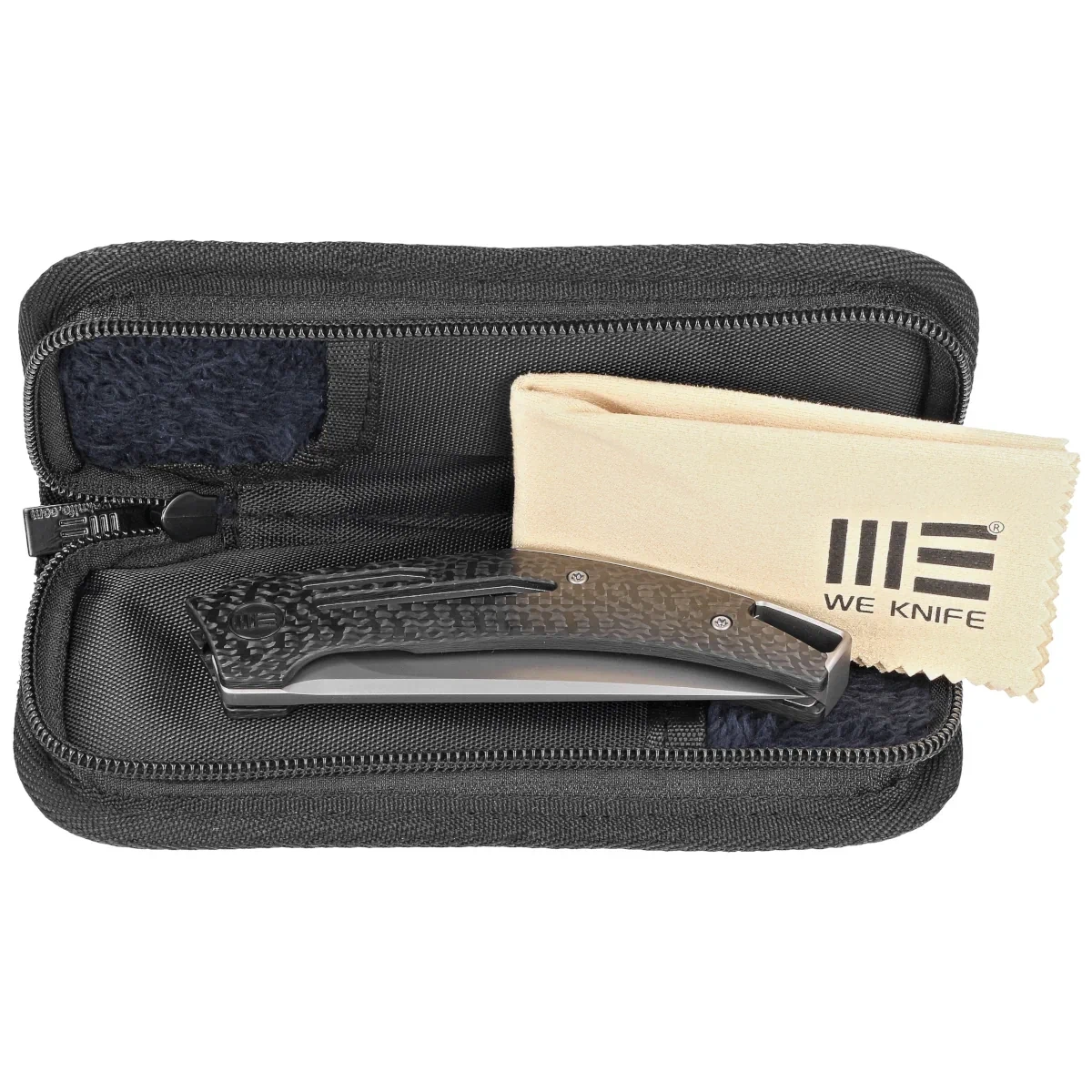 Handle - grips made of Twill Carbon Fiber (carbon fiber compressed under pressure with synthetic resin) with a characteristic spiral pattern. Attached to steel liners. Chamfered edges of the covers eliminate sharp edges. The sides were screwed to a solid titanium backspacer, giving assurance of many years of use. The pivot is decorated with a stylized WE Knife brand logo. A single-position (right) titanium deep-carry clip allows you to carry the knife discreetly in your pocket in tip-up (blade tip up) position. On the back of the Handle a lanyard hole, hidden in the backspacer, a place for a decorative or safety line.