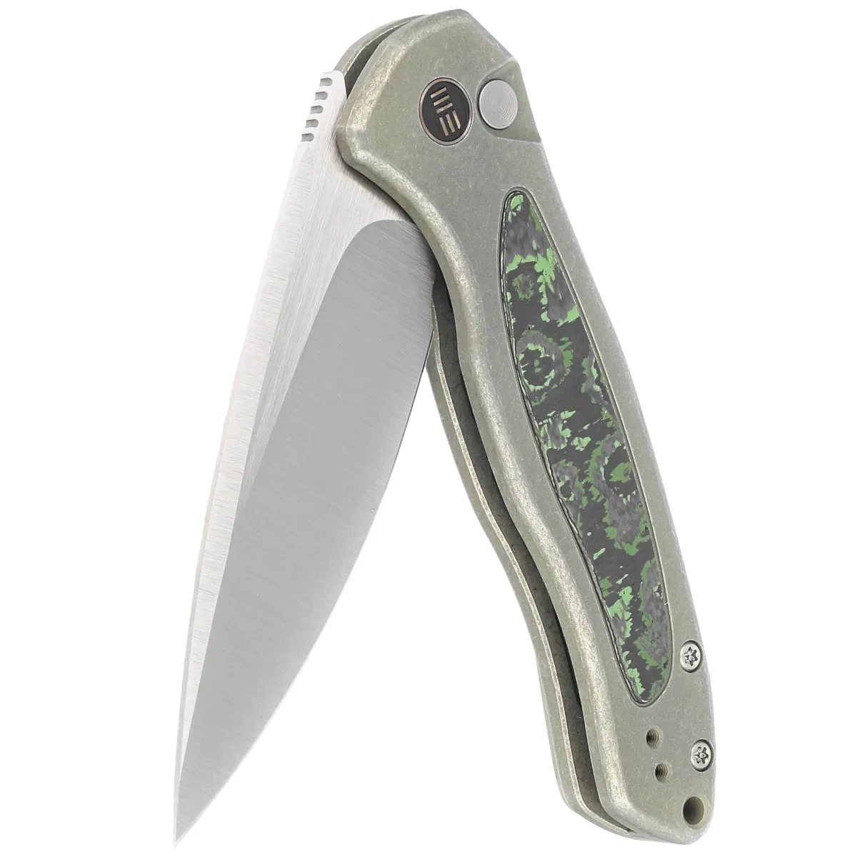WE Knife Button Lock Kitefin LE No 000/157 Green Titanium/Jungle Wear Fat Carbon, Hand Polished Satin CPM 20CV (WE19002N-2)