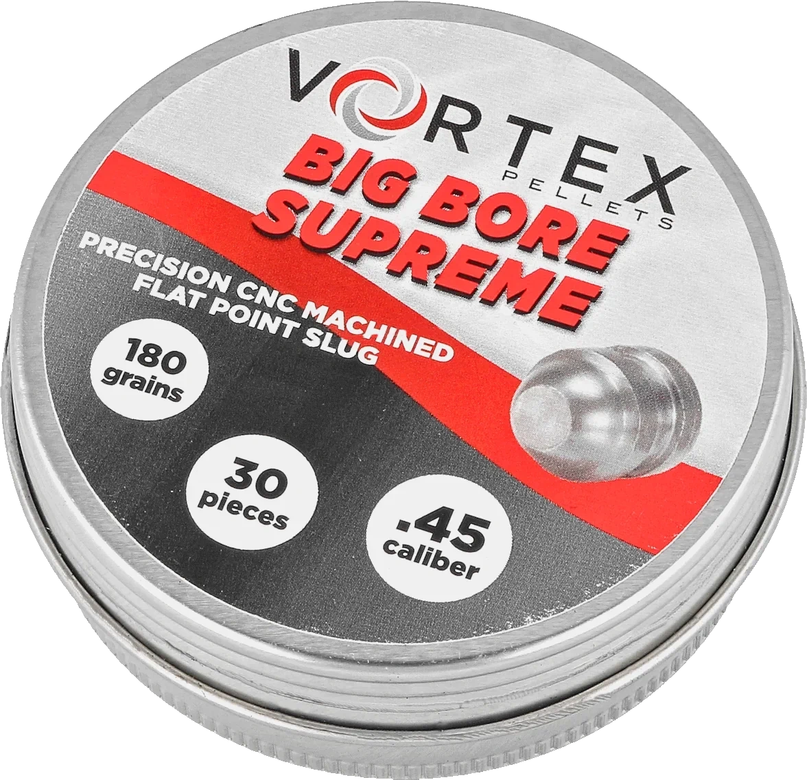 Vortex Big Bore Supreme .45 (180 gr) is an extremely precise, heavy Slug Hollow Point pellet by Hatsan USA in 11.43 mm caliber. The CNC milling production process ensures accuracy and consistency, unmatched by competing pellets made through casting or stamping—each individual pellet is machined to perfection with precision down to hundredths of a millimeter, free from flash, pores, or other mold-related defects. Designed for precision shooting at medium and long distances, as well as pest hunting. Sealed metal tin, 30 pcs.
