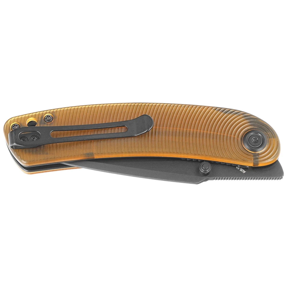 Handle - grips made of transparent Ultem™ plastic, textured to improve grip confidence, are bolted to the knife's steel frame. The so-called open-backed design without the typical backspacer, fastened together with steel spacer sleeves for easy cleaning. The simple, sturdy construction gives assurance of many years of use. Pivot decorated with stylized manufacturer's logo. Two-position (right/left) steel deep carry clip allows you to carry the knife discreetly in your pocket in tip-up position (blade tip up). Above the clip a lanyard hole, a hole for threading a safety or decorative cord.