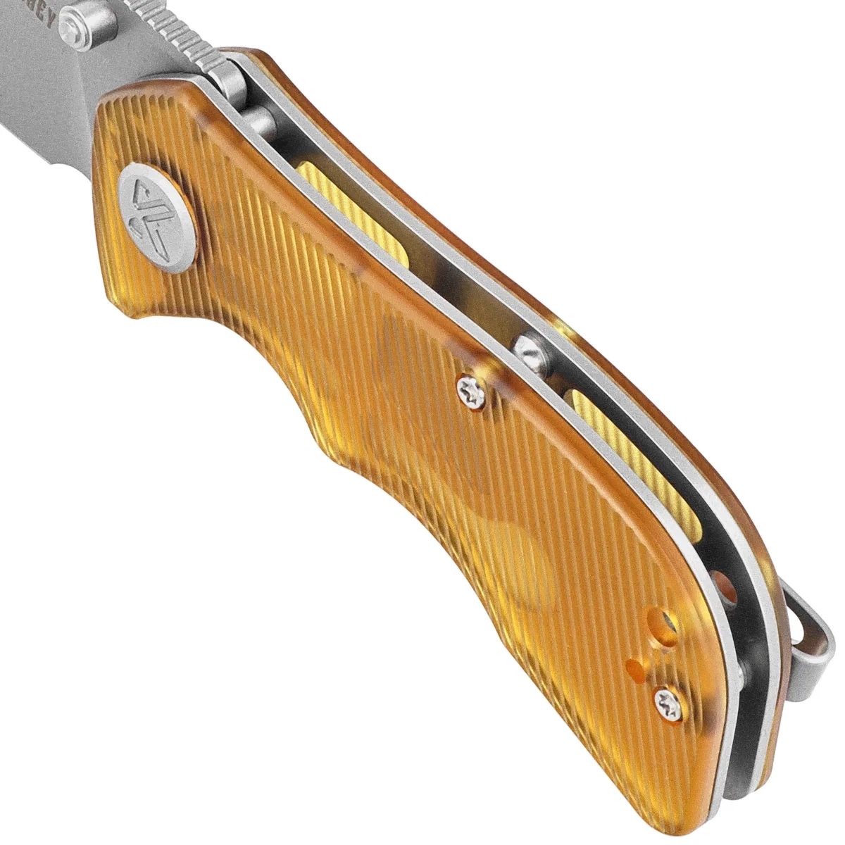 Handle - grips made of transparent Ultem™ plastic, textured to improve grip confidence, are bolted to the knife's steel frame. The open-backed design, so called, fastened together with steel spacer sleeves, reduces weight and makes cleaning easier. The simple, sturdy design gives assurance of many years of use. The pivot axis is decorated with a stylized screw with the company logo. A two-position (left/right) metal deep-carry clip allows you to carry the knife discreetly in your pocket in the tip-up (blade tip up) position. Above the clip a lanyard hole, a hole for threading a safety or decorative cord.