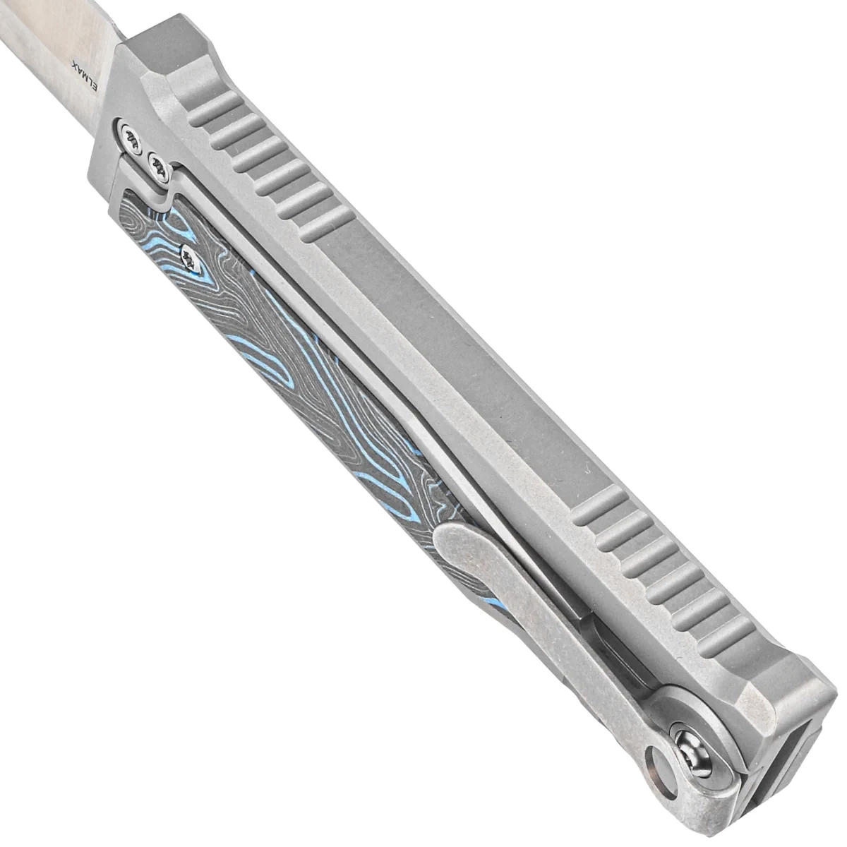 Handle - CNC-milled titanium Exoskeleton, an external skeleton with a movable top section responsible for opening and closing the knife. The chamfered edges of the sheaths eliminate sharp edges, and the perfectly matched G10 composite inlays in the unique Damascus pattern add an exclusive touch and improve grip security. On the right side, an artful sliding lock slider for advancing/retracting the blade. Once it is moved to the secure "lock" position, the knife will not be opened/closed by accident. A single-position titanium (right) deep-carry clip allows you to discreetly carry the knife in your pocket in tip-down position (blade tip down).