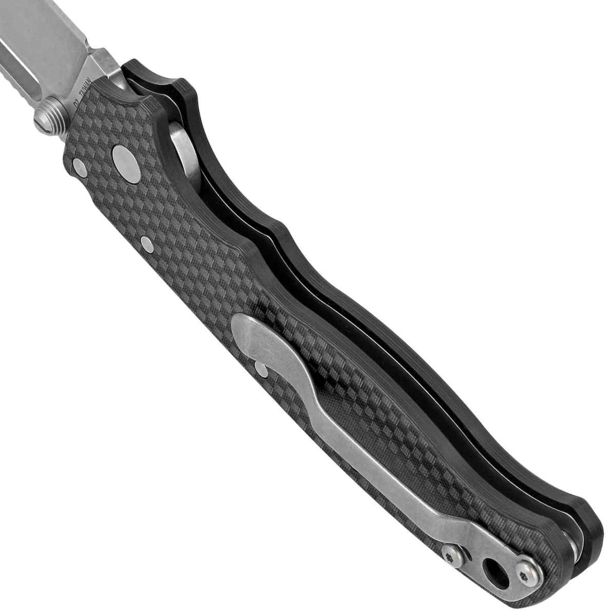 Handle - grips made of Carbon Fiber, a virtually indestructible plastic that is insensitive to weather conditions, resistant to chemicals and mechanical damage. Chamfered edges of the covers eliminate sharp edges and characteristic surface texturing improves grip confidence. A single-position, right-handed clip allows the knife to be carried in the tip-up position, with the tip of the blade upward. A left-handed clip is included.