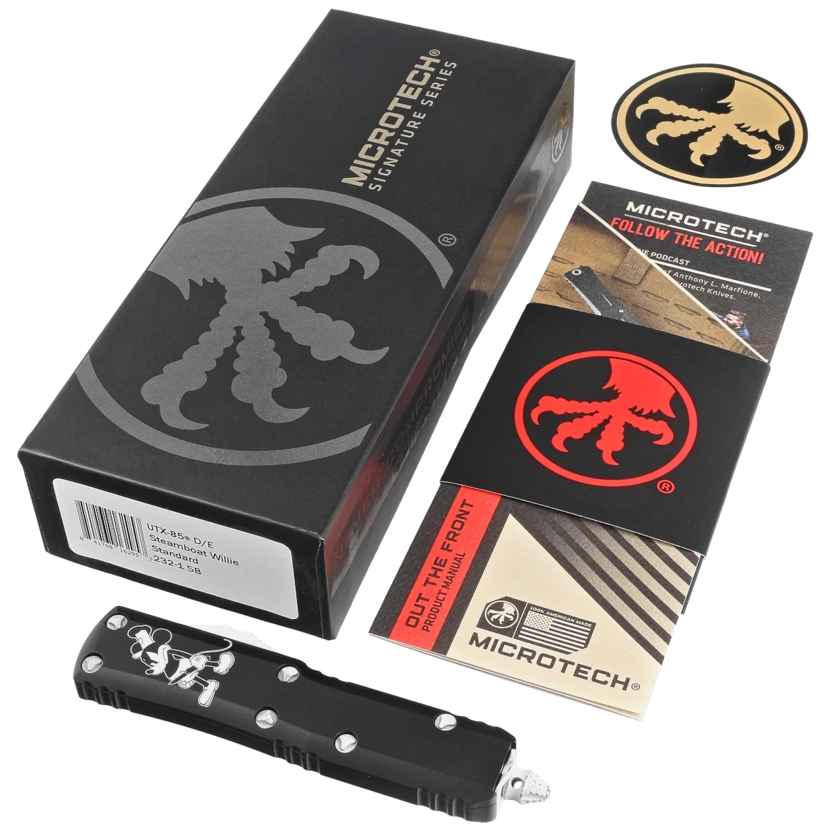 Microtech UTX-85 D/E Steamboat Willie Signature Black Aluminium, Antique White M390 OTF knife (232-1SB)