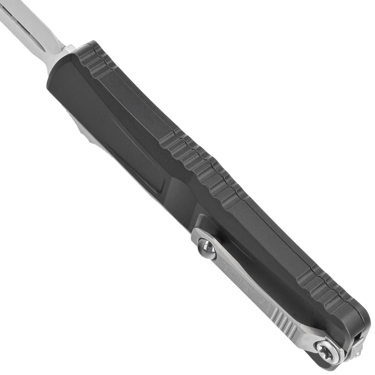 Handle - made with excellent precision in 3D technology on CNC milling machines, from black anodized coated 6061-T6 aluminum. The surface texture of the Handle and the deep notches (jimping) on it make the knife non-slip in the hand during use. The slim profile and the milled two-position (right/left) solid deep-carry clip allow the knife to be carried discreetly in the pocket, in tip-down (blade tip down) position. The clip bears the Microtech logo, serial number and production date. The Handle is finished with a glass breaker, a solid steel triangle, into which a tungsten carbide ball has been pressed. It also features a hole for interweaving a decorative cord.