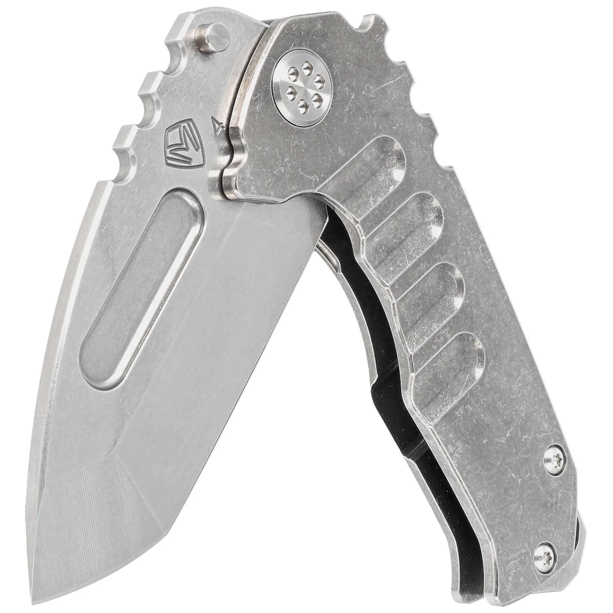 Blade - Praetorian Genesis T with T/E (Tanto Edge) profile  finished with a machine-applied "tumbled" technique. Hand-crafted hollow grinds offer excellent cutting performance paired with outstanding durability. The striking embossing increases the strength, using them to open the knife. For increased insensitivity to contamination, phosphor bronze washer was used, making the pivot axis more resistant to field work. A powerful titanium frame lock bar secures the knife from folding, unfolded and secured the knife is as solid as an armored cash register.