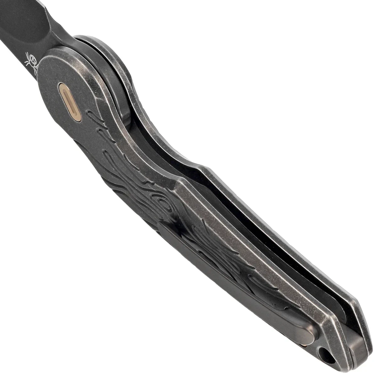 Handle - is thick pieces of 6AL4V titanium subjected to a bath in fine Stonewashed pebbles and then coated with black PVD coating, beautifully milled using CNC machine tools. A solid titanium backspacer gives the whole structure the desired rigidity. The simplicity and solidity of the construction give the assurance of many years of use. The single-position clip (right), made of titanium, allows the knife to be carried in tip-up position. Above the clip a lanyard hole, a hole for threading a decorative or security cord.