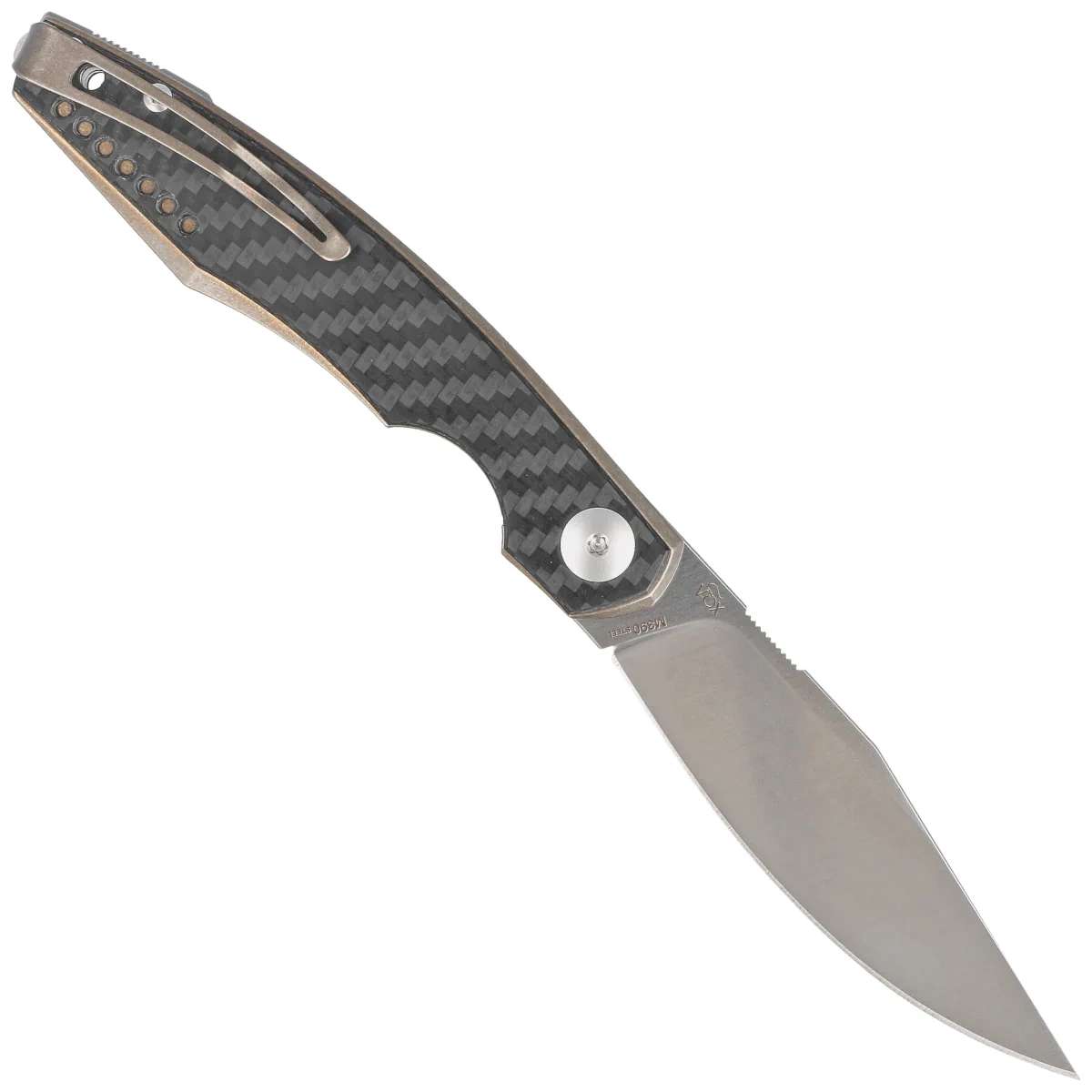 Handle - made of solid titanium 6AL4V stonewashed finish and bronze anodized. Contouring of the covers eliminates sharp edges. On both sides there is an overlay (cap) made of Carbon Fiber. The grips are joined together with a titanium backspacer. A single-position clip (right), made of titanium, allows the knife to be carried in tip-up position. Under the clip a lanyard hole, a hole for attaching a safety or decorative cord.