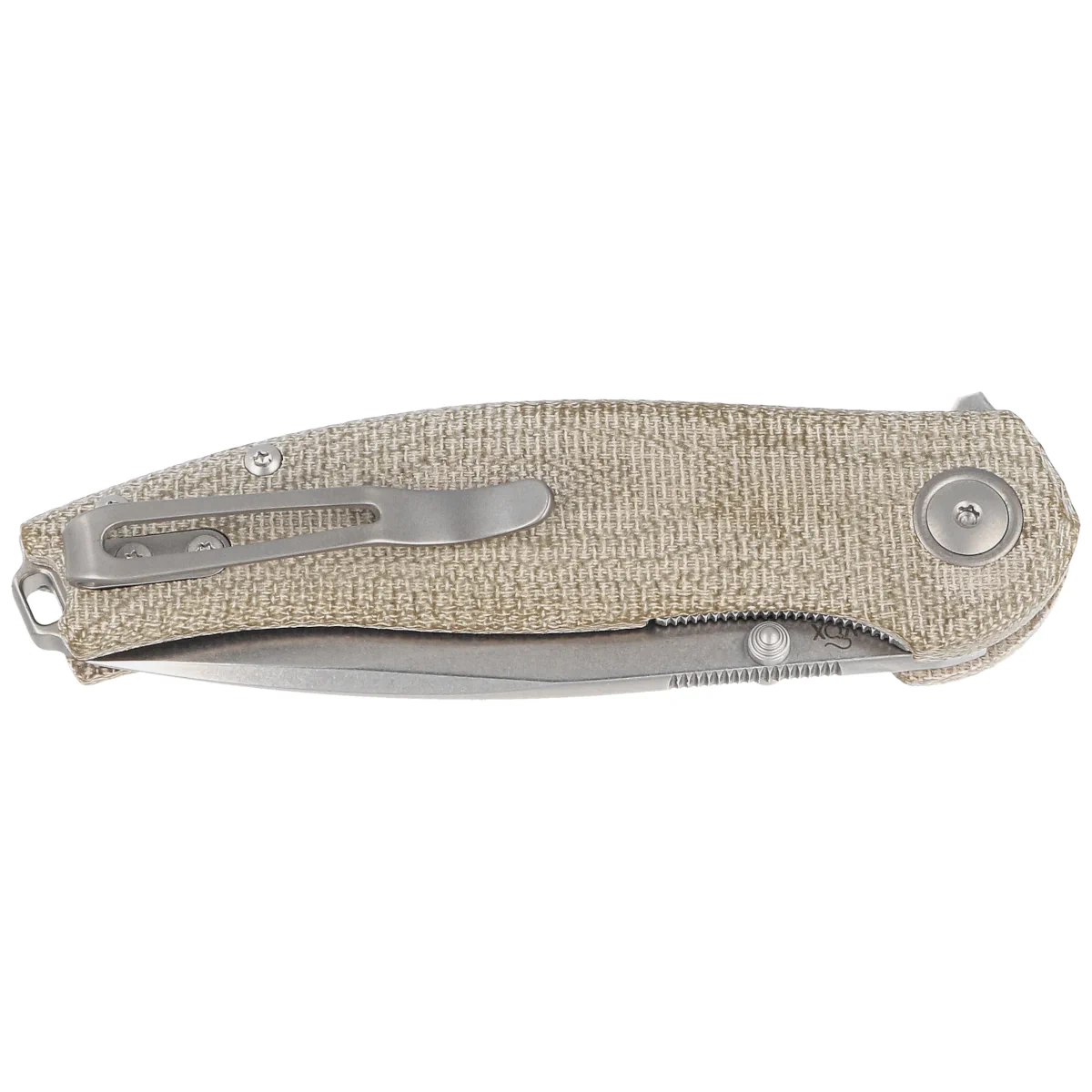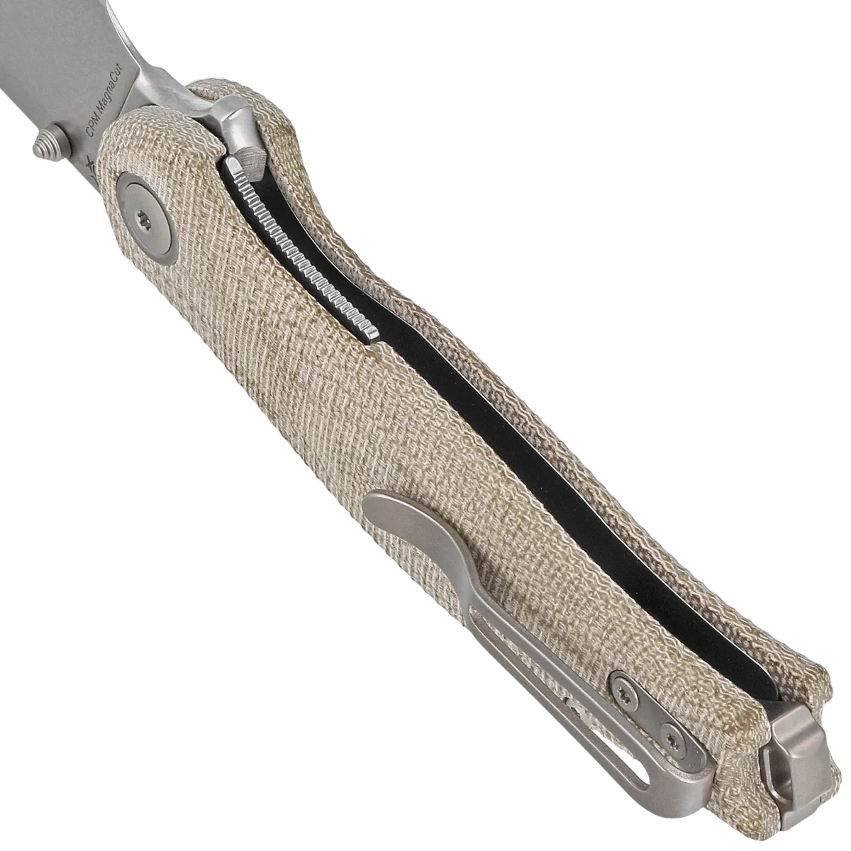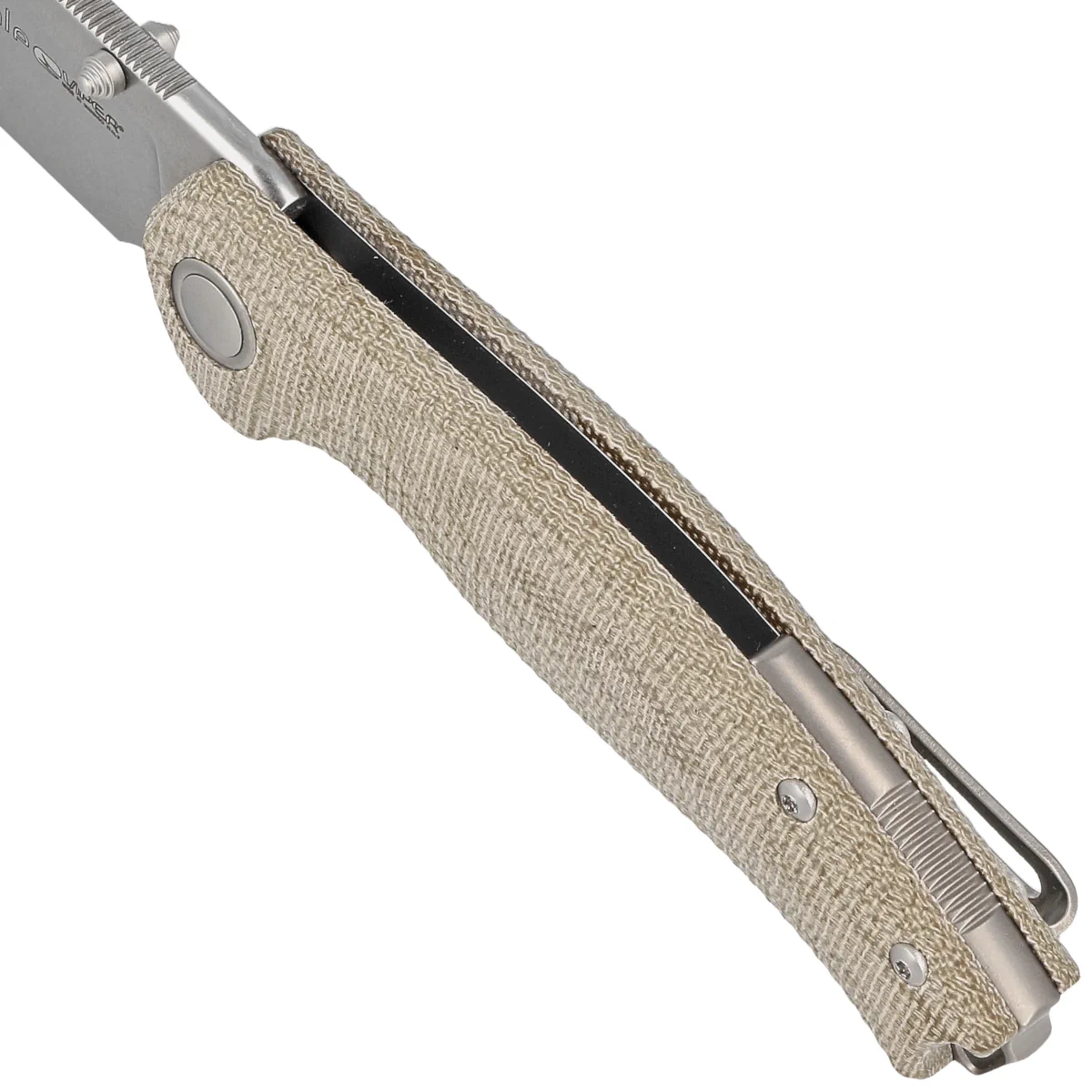 Handle - grips made of Canvas Micarta, a virtually indestructible plastic that is impervious to weather, resistant to chemicals and mechanical damage., artfully milled to create a texture on the handle. Joined together by a CNC-milled backspacer, the knife retains the desired structural rigidity. The backspacer and the decorative ring around the pivot, the so-called pivot collar, are made of bronze anodized titanium. The fore finger groove, made on the front, improves grip security, while forming a guard with the flipper to prevent the hand from slipping on the blade. A right-handed, single-position titanium deep-carry clip allows the knife to be carried discreetly in the tip-up (tip up) position. At the end of the Handle lanyard hole, a hole for a cord.