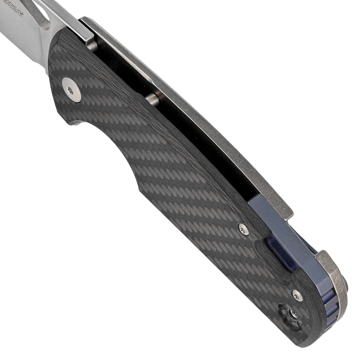 Handle - one side is a thick piece of black Carbon Fiber (carbon fiber compressed under pressure with synthetic resin), and the other side is solid titanium. The covers were attached to a CNC-milled titanium backspacer anodized blue, which provides the desired rigidity and strength to the whole structure. CNC-machined double-sided (right/left), two-position deep carry clip allows to carry the knife discreetly in tip-up position (blade tip up). Above the clip a lanyard hole, an oval slot for a cord.